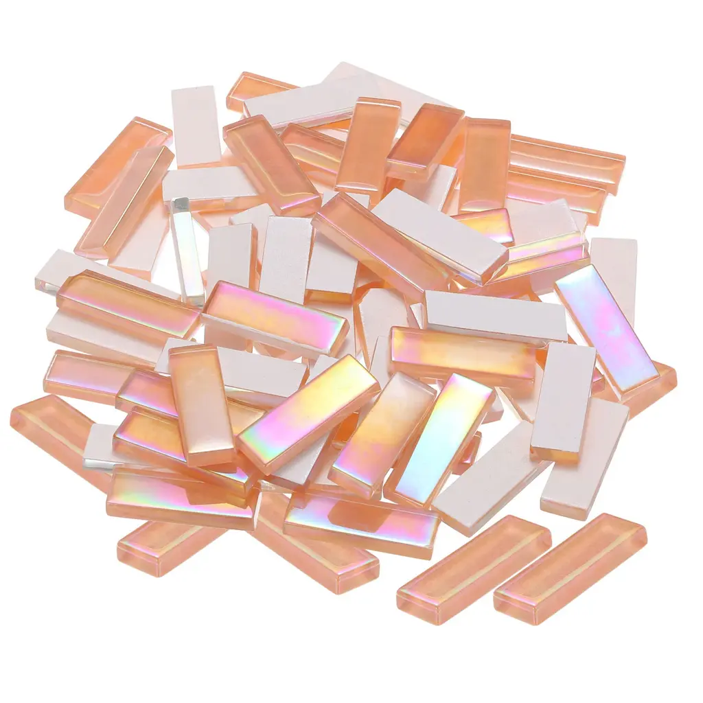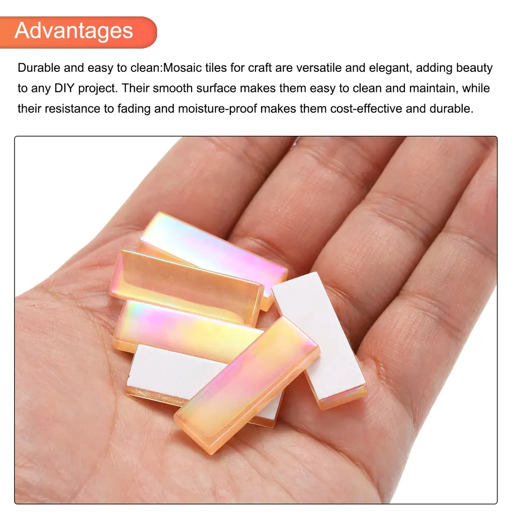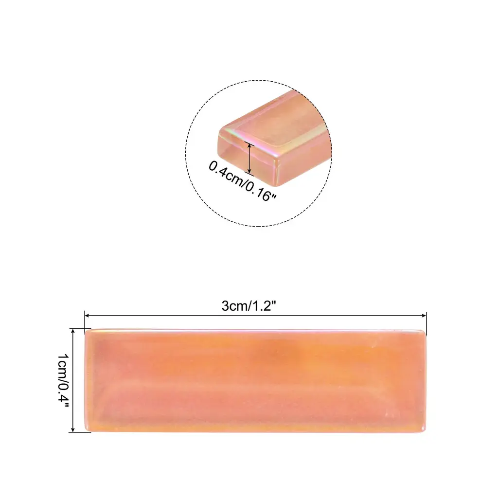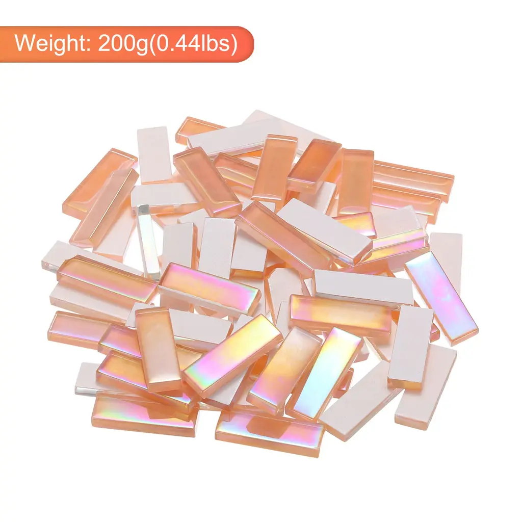 What is this?This stained crystal glass mosaic bulk includes a variety of colors, as well as glass mosaics of different sizes and processes, perfect for DIY projects such as coasters, picture frames, ceramic vases, garden decorations, TV walls, etc.What will I get?Color: Iridescent Orange;Weight: 200g(0.44lbs)/Set;Finish Type: Polished;Installation Type: Glue Down(Not Included Here!);Length: 1.2 Inch;Width: 0.4Inch;Thickness: 0.16Inch;In the package of: 1 Set x 200g Stained crystal glass mosaic, totally 200g(0.44lbs)Are there any advantages of the product?Durable and easy to clean:Mosaic tiles for craft are versatile and elegant, adding beauty to any DIY project. Their smooth surface makes them easy to clean and maintain, while their resistance to fading and moisture-proof makes them cost-effective and durable.How to use it?Prepare the surface by ensuring it's clean, dry, and flat. Apply suitable adhesive and press the mosaic tiles firmly in place. Leave the adhesive to dry for 24 hours before grouting the mosaic tiles. Finally, clean off any excess grout with a damp sponge.What should I notice?Wear protective gloves when handling mosaic tiles to prevent hurt from edges. Avoid exposing the mosaic tiles to extreme temperatures, direct sunlight, or harsh chemicals. Follow the manufacturer's instructions carefully for optimal results.