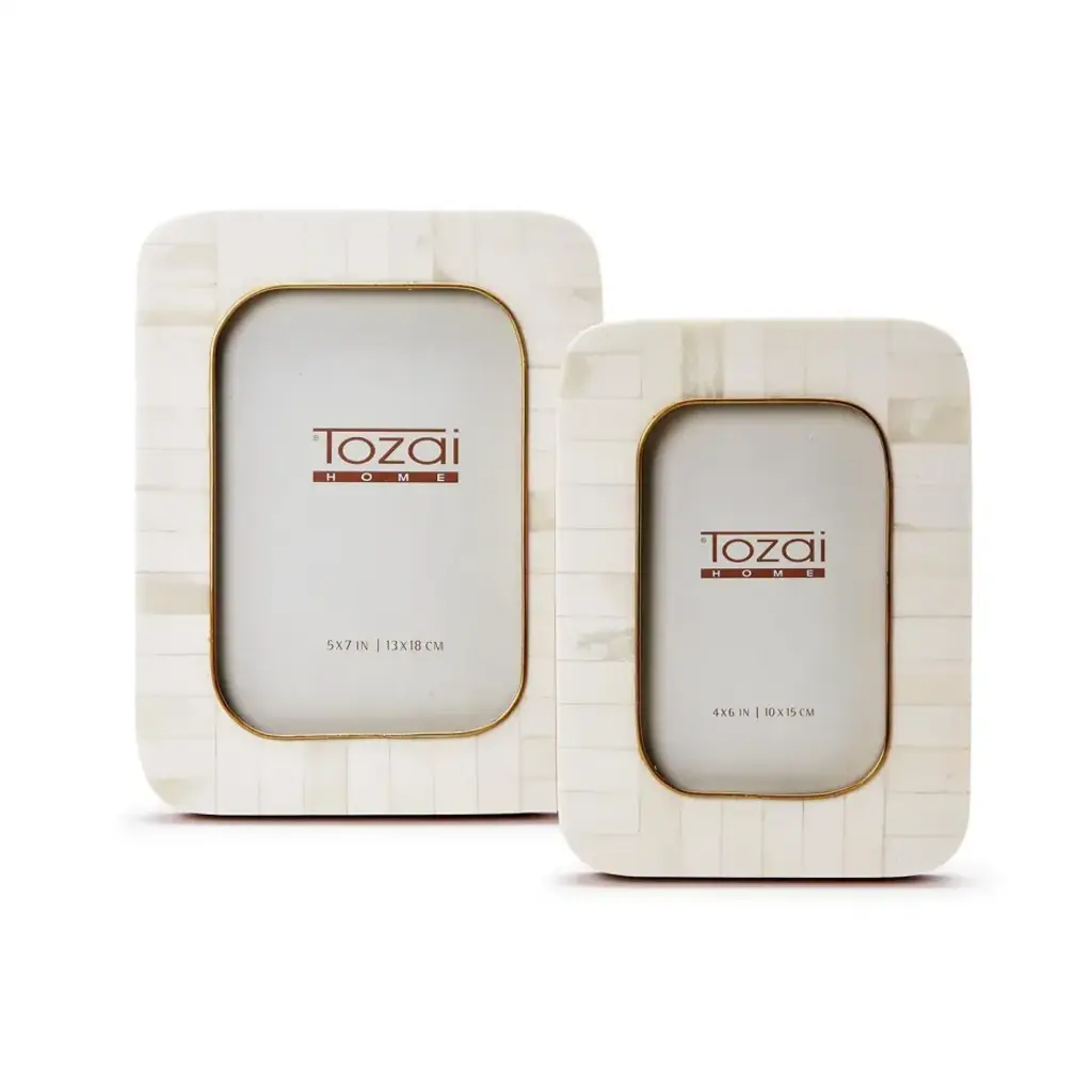Inspired by classic florals, the set of frames captures a bit of nature by utilizing acacia wood to create the design. Each petal is cut by hand and inlaid into a bed of soft white resin creating a neutral place to show off your favorite photos.