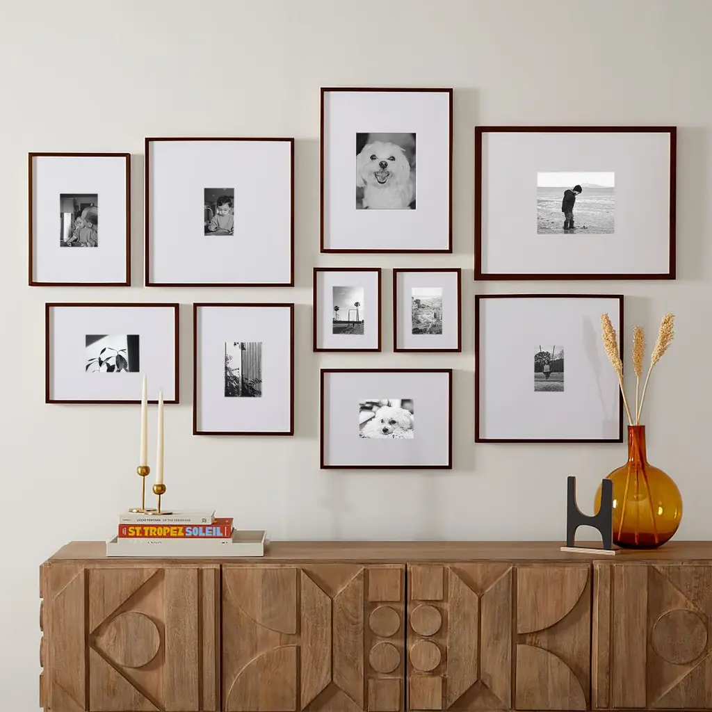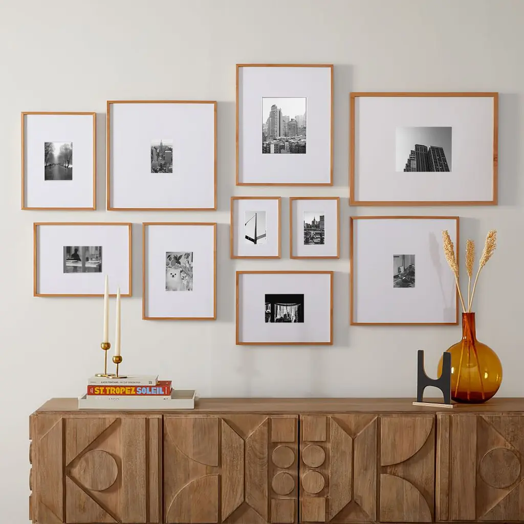 Mixed sizes give you several ways to display. Quick and easy to hang with included D-rings. Tempered glass protects your photo or art piece.