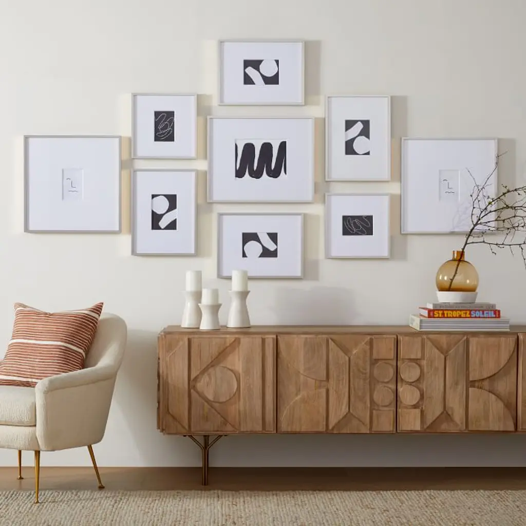COPY Wood or powder-coated metal frames. Tempered glass. 2 removable, acid-free paper mats included with each frame. Can be hung vertically and horizontally. D-rings included. Sold as a set of 9. Made in China.