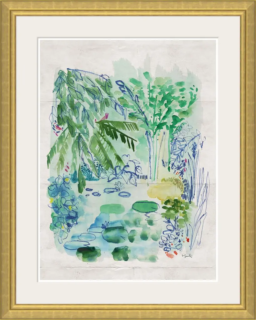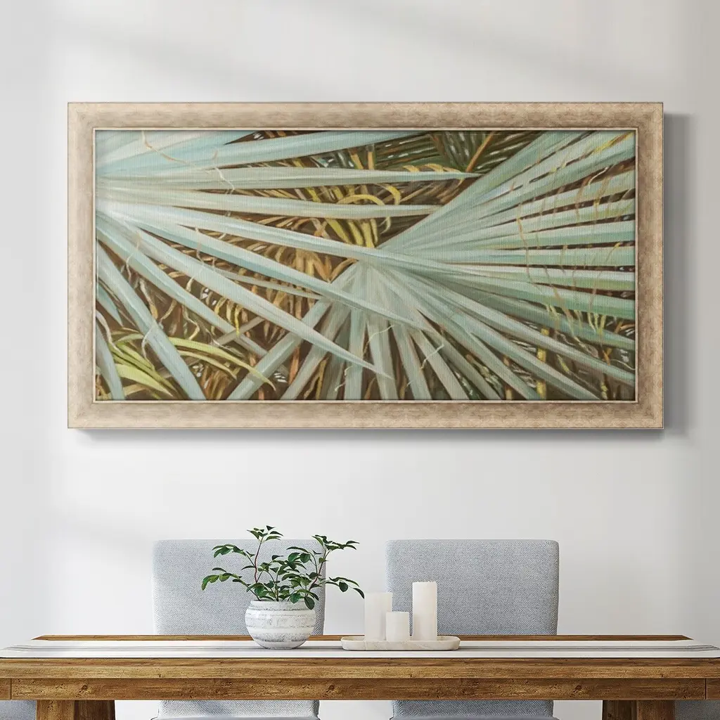 This tropical work is printed on deckled matte paper, floated over an ivory mat, and displayed in a distressed silver leaf frame. Arrives ready to hang.