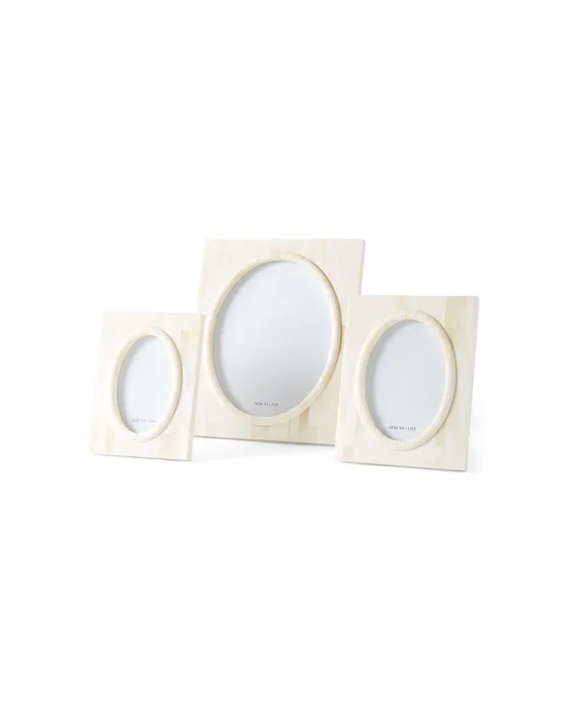 Bring a fresh look to your edit with the scalloped edge and woven texture of this rattan picture frame. Its natural finish layers organic texture onto any surface while tying a personal touch into your decor. The velvet back is fitted with D-rings for wall mounting.