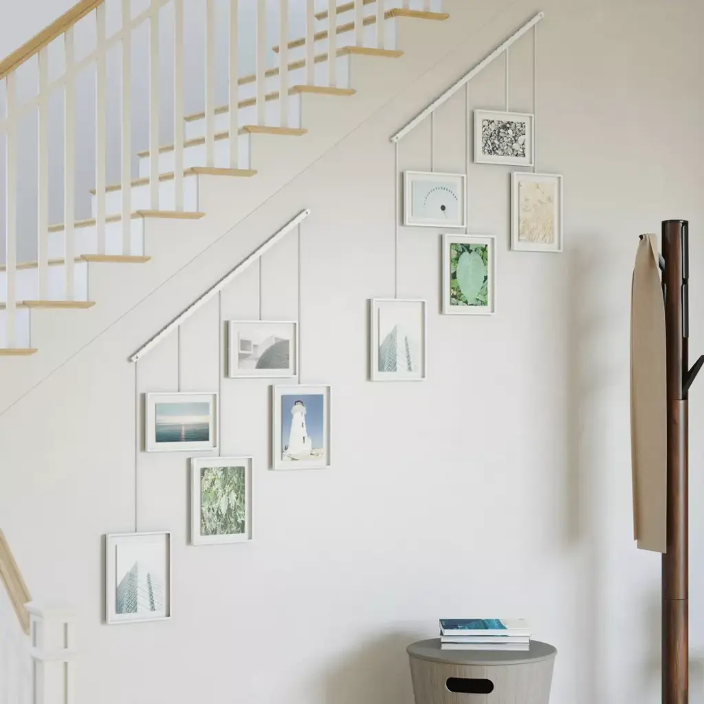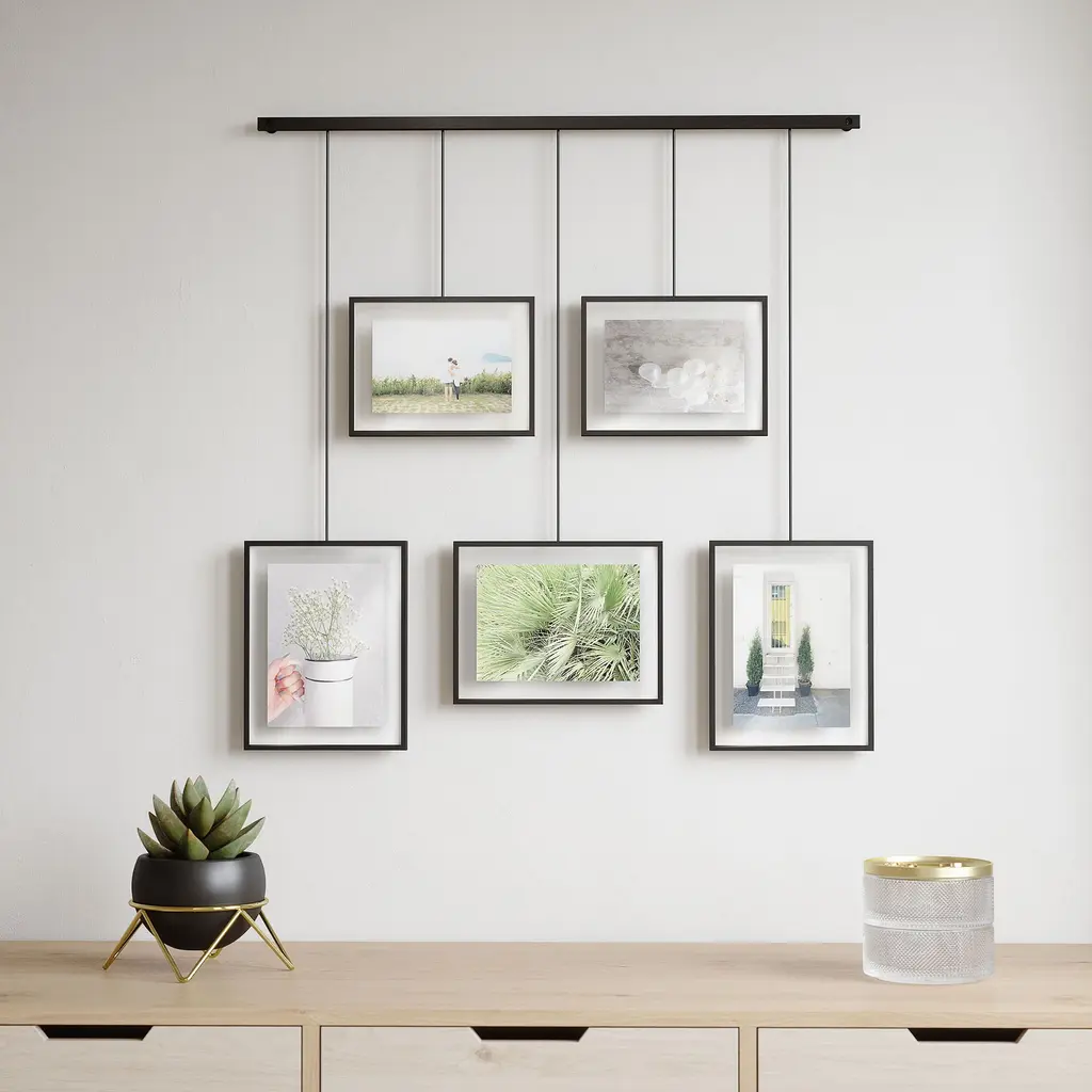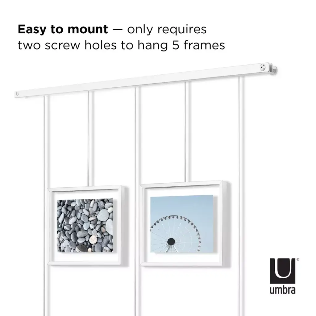 Hanging and leveling multiple picture frames on your wall can be a hassle. Not to mention all the damage that comes with drilling screw holes for each. Introducing Exhibit Photo Display from Umbra Exhibit Photo Display features a wall-mounted brushed metal ledge with clips and brackets to hold five gallery-style picture frames of various size, all while reducing the amount of damage typically left on walls. The brackets with the frames are suspended from the ledge, which allows them to be moved around to create various layouts. Its flexible horizontal hanging properties make Exhibit a great addition to your stairway due to its ability to be hung angled. Use Exhibit to set a décor accent in your living room, bedroom, entryway, office or studio and give it a modern update while curating your favorite photos and artwork. Exhibit is customizable to your layout preference. The picture frames can be moved around the metal ledge and rotated to a landscape or portrait orientation. Exhibit features two 4x6 and three 5x7 picture frames to fit all of your favorite photos, artwork, illustrations and more. Complementary to multiple décor styles, Exhibit makes is a beautiful wall décor piece that allows you to change out images easily to refresh your room any time you want. Purchase more than one Exhibit to create an engaging wall art display For an easy-to-use gallery-inspired multi-photo display, order Exhibit from Umbra today! About Umbra: A global product design company providing original, modern, casual and functional design for the home.