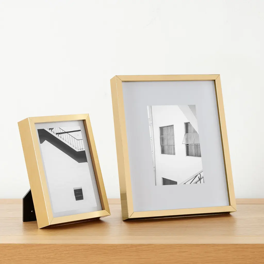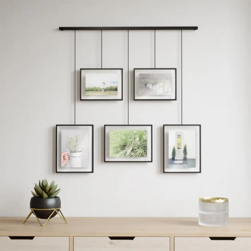 If you've always wanted a gallery wall but hesitated from putting numerous holes in your wall, the Umbra system has the solution. The wall-hanging system suspends five frames from a single ledge that mounts on the wall. Five bracketed framestwo 4"x6" and three 5"x7"can be positioned along the bar and rotated to landscape or portrait orientations. Hanging rods can also be interchanged to further customize your layout. The ledge can also be hung at an angle, making it a great way to dress up stairwell walls. Finished in black, the hanging picture frames allow you to easily switch out photographs and artwork for changing displays and an instant room refresh.