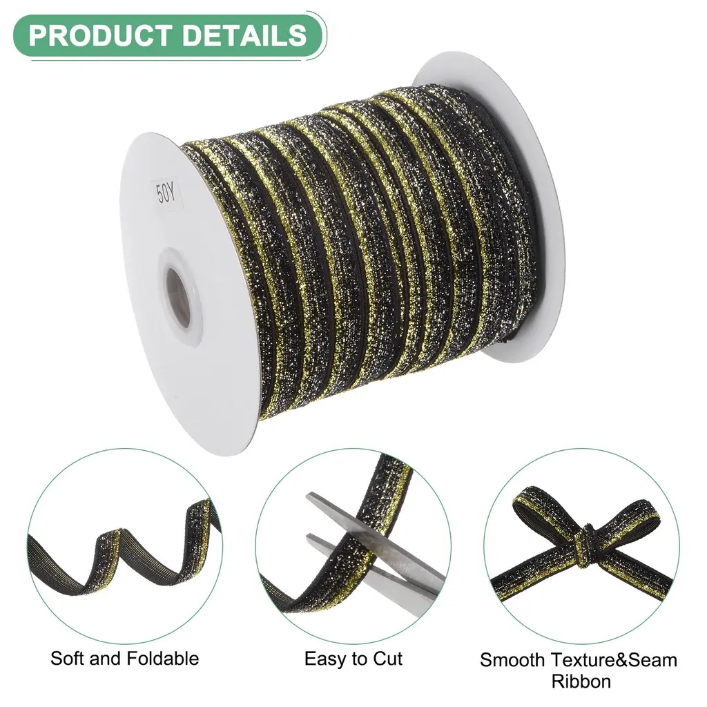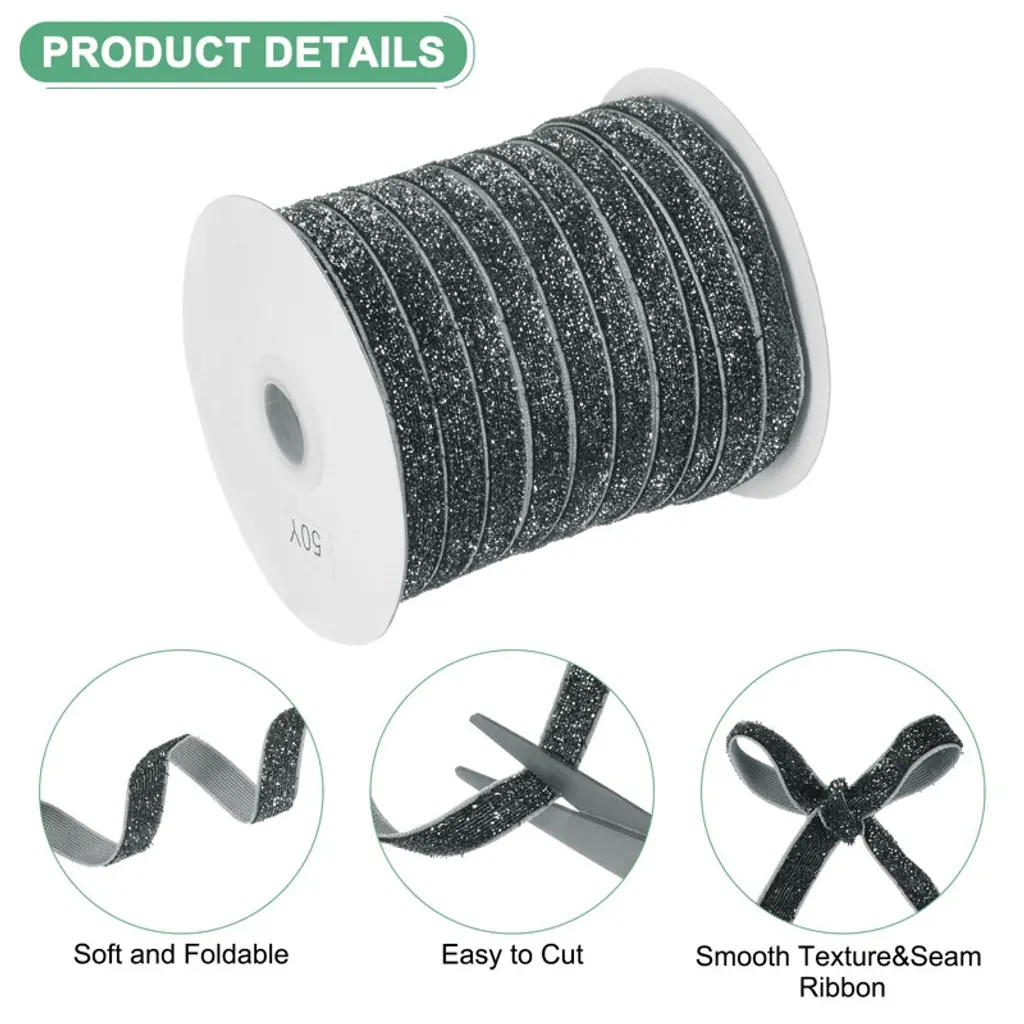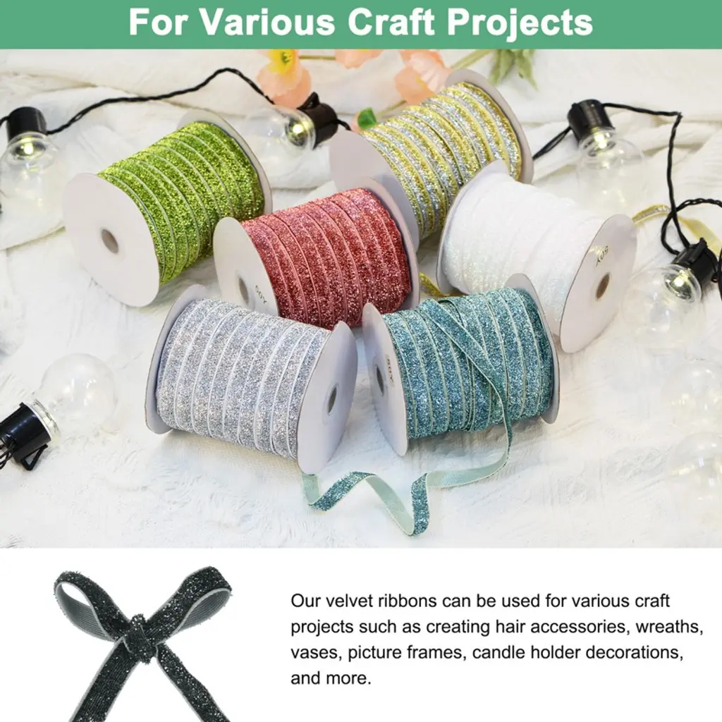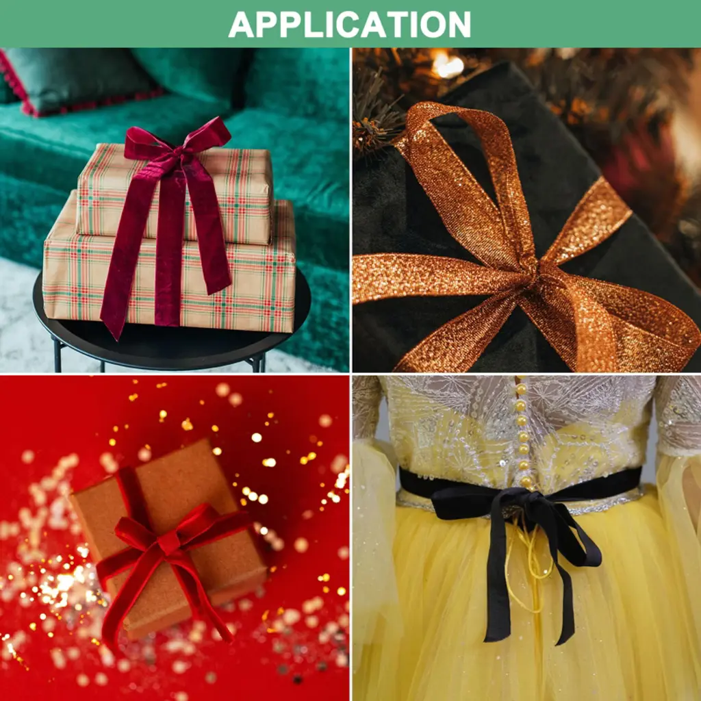 The velvet ribbons have various applications for craft projects such as creating hair accessories, wreaths, vases, picture frames, and candle holder decorations. They can also be used to create stylish chair sashes or table runners for special occasions or everyday use. The velvet material adorned is soft to the touch, flexible, and sparkles, ensuring a comfortable and pleasant feel. The flexible ribbon makes it easy to create beautiful bows and loops. It holds its shape well and can be easily tied to achieve the desired look. Determine the desired size and color of the ribbon based on your needs.