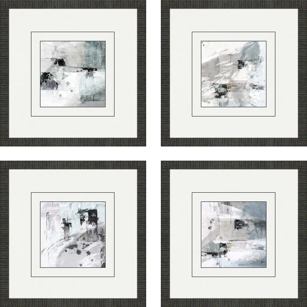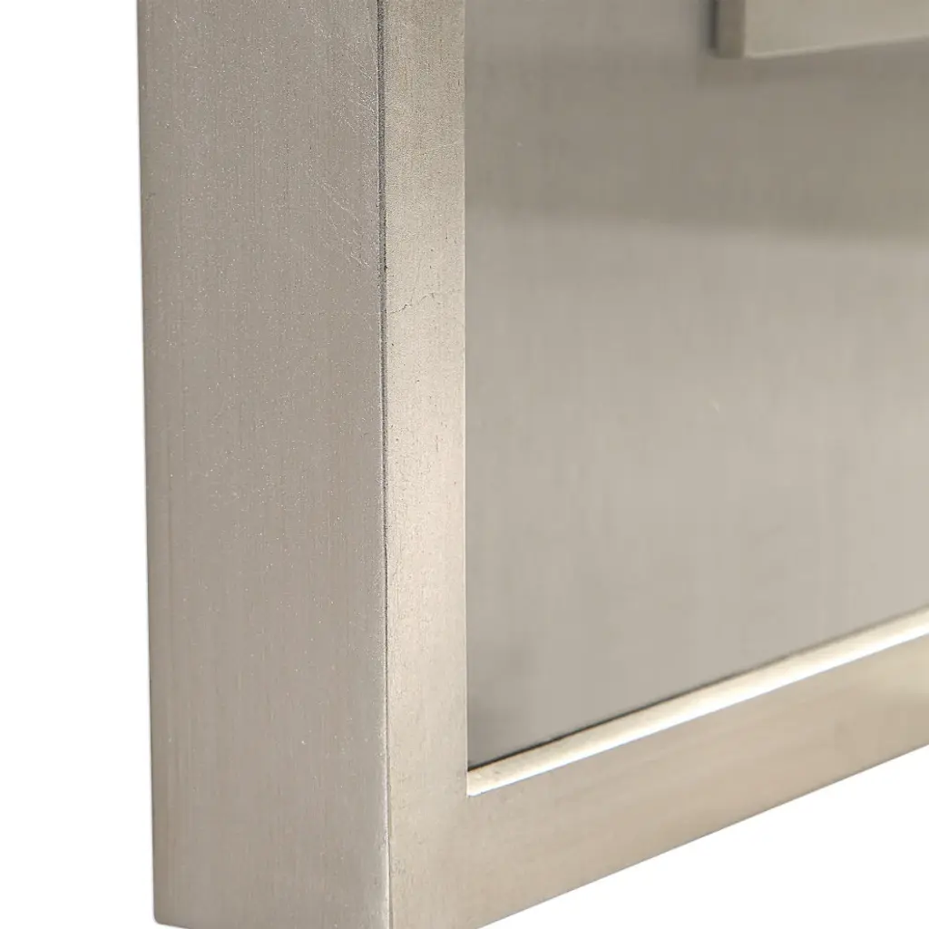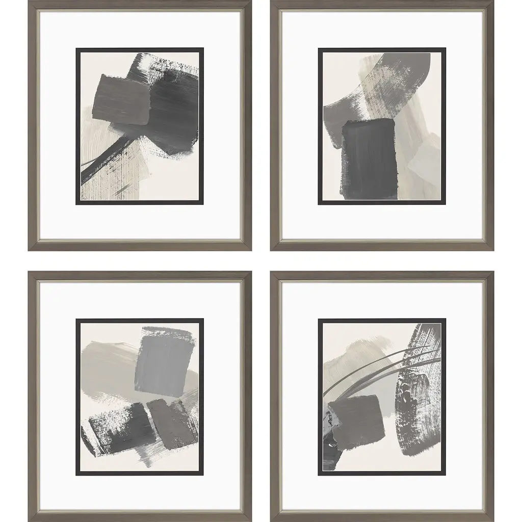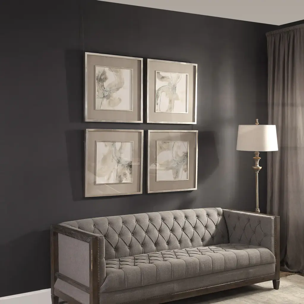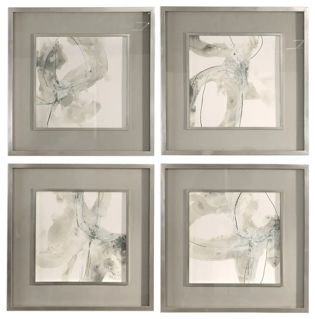 Siver leaf frame and fillet, warm gray mat, white background with warm gray, charcoal and off white print colors.