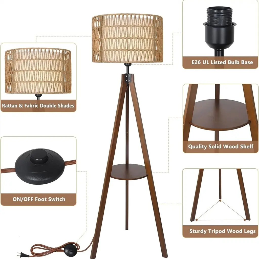 【Rubber Wood Tripod Floor Lamp】This tripod lamp comes with two removable lampshades, one is a 100% hand-woven natural rattan shade and one is a soft fabric shade. Combination of natural elements makes this rattan floor lamp perfect for bohemian, rustic, vintage and industrial home styles. It has a unique stem with three rounded wooden holders that makes the boho floor lamp stable enough, prevent tipping and keep you and your family safe at home. 【Floor Lamp With Shelves】The shelf of this tripod lamps for living room is made of high-quality Nature Rubber wood and can be used to store and display objects. You can put plants, photo frames, books or any small things you want on it. This mid century floor lamp is both practical and fashionable, and is the highlight of your home decoration. Perfect for living room, bedroom, rec rooms, study, office and corner sofa. 【Floor Lamp Size & Safety】This wood floor lamp is 59 inches high. The rattan shade is 17.7 inches in diameter and 9.8 inches in height. The E26 socket of this tall floor lamp is UL listed, which makes it safe and reliable to use. The farmhouse floor lamp is compatible with incandescent/vintage filament/halogen/LED bulbs (bulb not included, up to 60W). You can choose different style bulb and color temperatures to create different atmospheres. 【Convenient Foot Switch】There is a on/off foot switch on the cord of the floor lamp for bedroom, which is very convenient to operate. Free your hands to do other things without bending down to turn off the light, convenient for the elderly or inconvenient people. The 10.4ft long cord allows you to move this standing lamps around the room as you like. This rustic floor lamp can be easily assembled without any tools, you just need to follow the instructions to screw all the parts together.