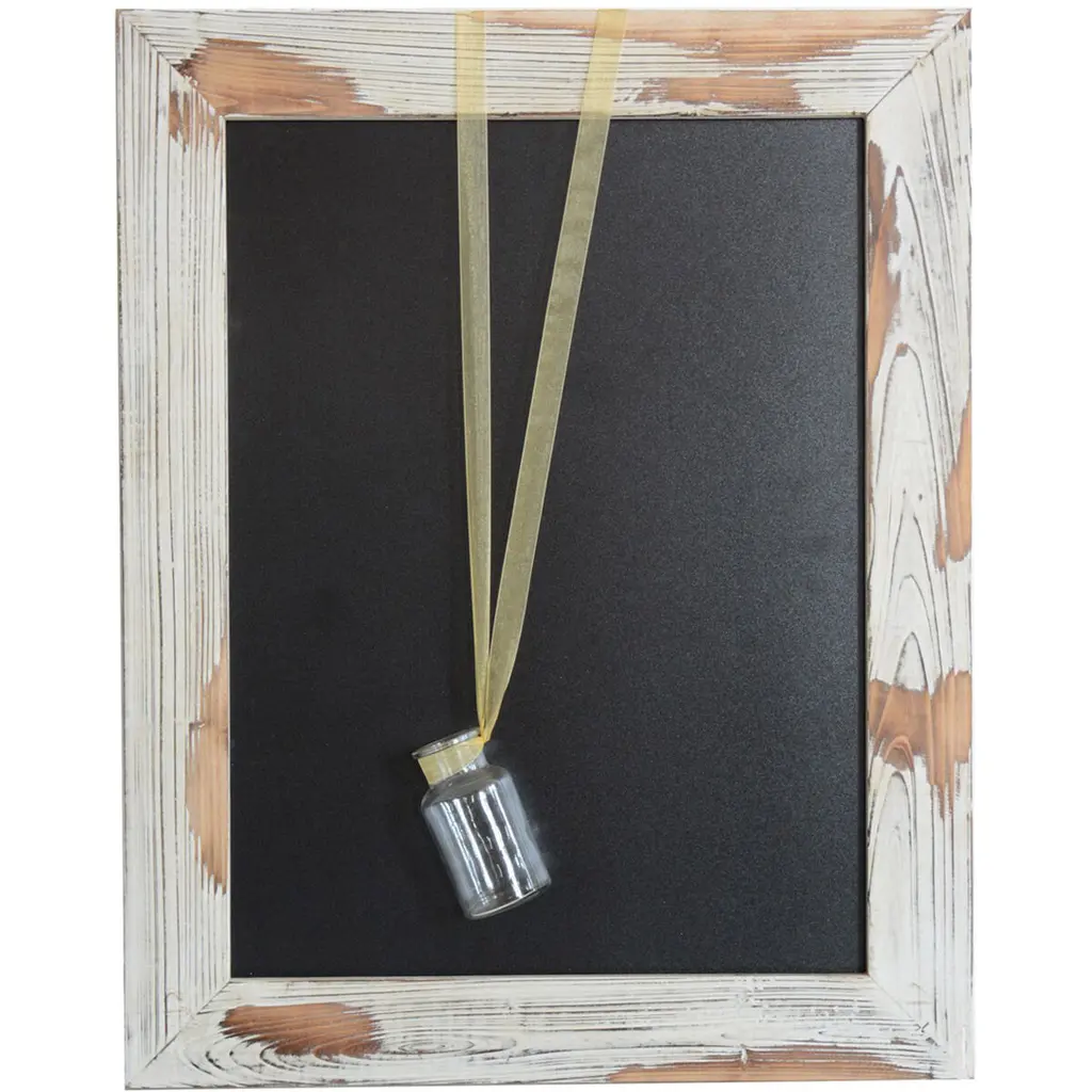 A small wooden picture frame adorned with small gem-like trinkets on a distressed grey finish.