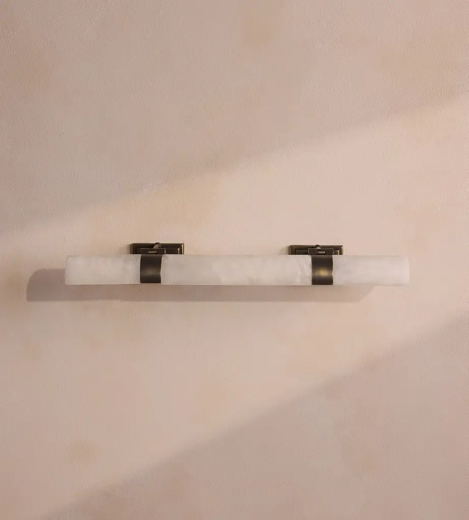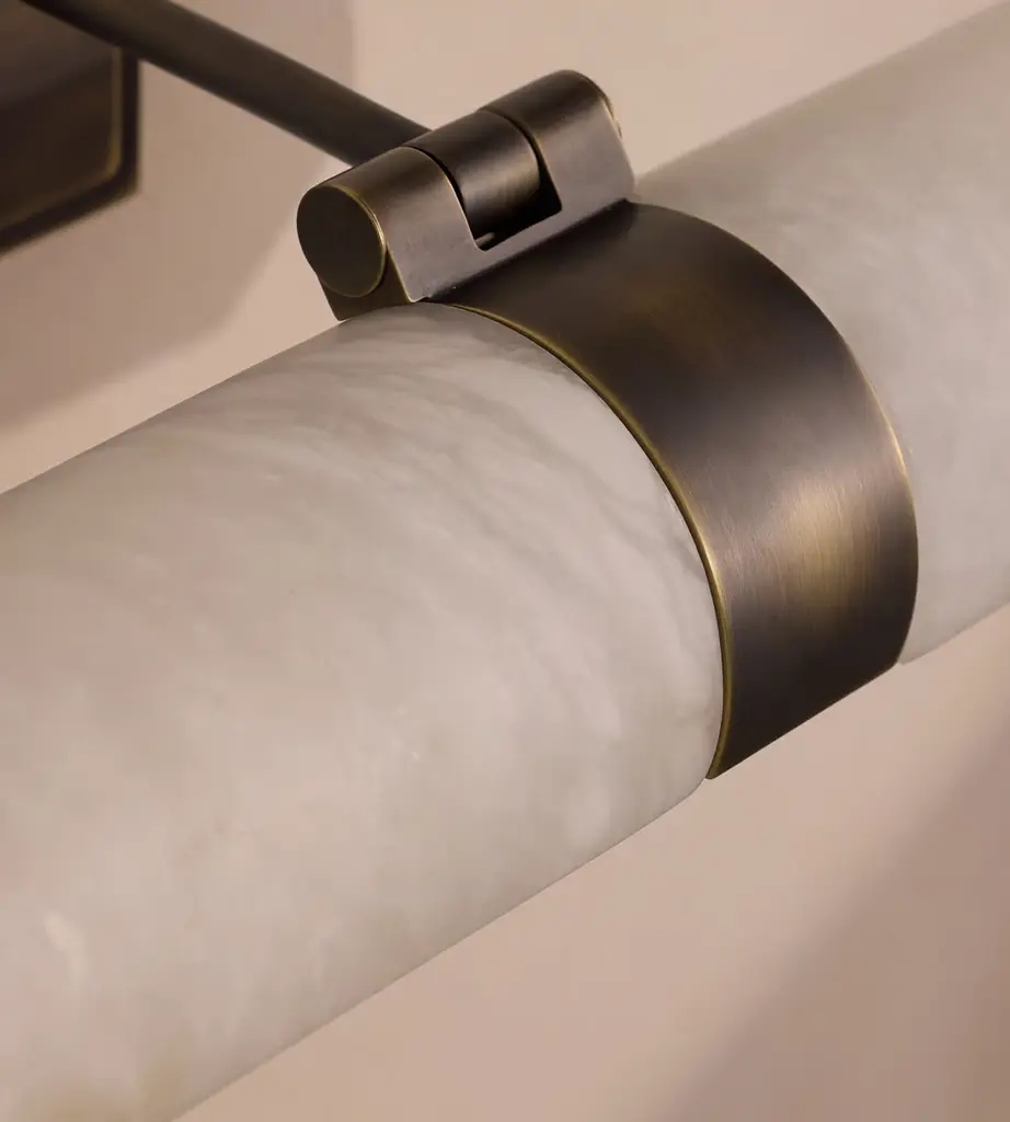 Mounted on a blackened brass frame, honed alabaster shades can be adjusted to direct the light onto your artworks. Inspired by the styles that illuminate the artworks in Little House Balham, our Andros picture light is designed to showcase your own collection. Concealed bulbs are housed within a cylindrical alabaster shade, then mounted onto a blackened brass arm made to sit above wall-mounted pieces.