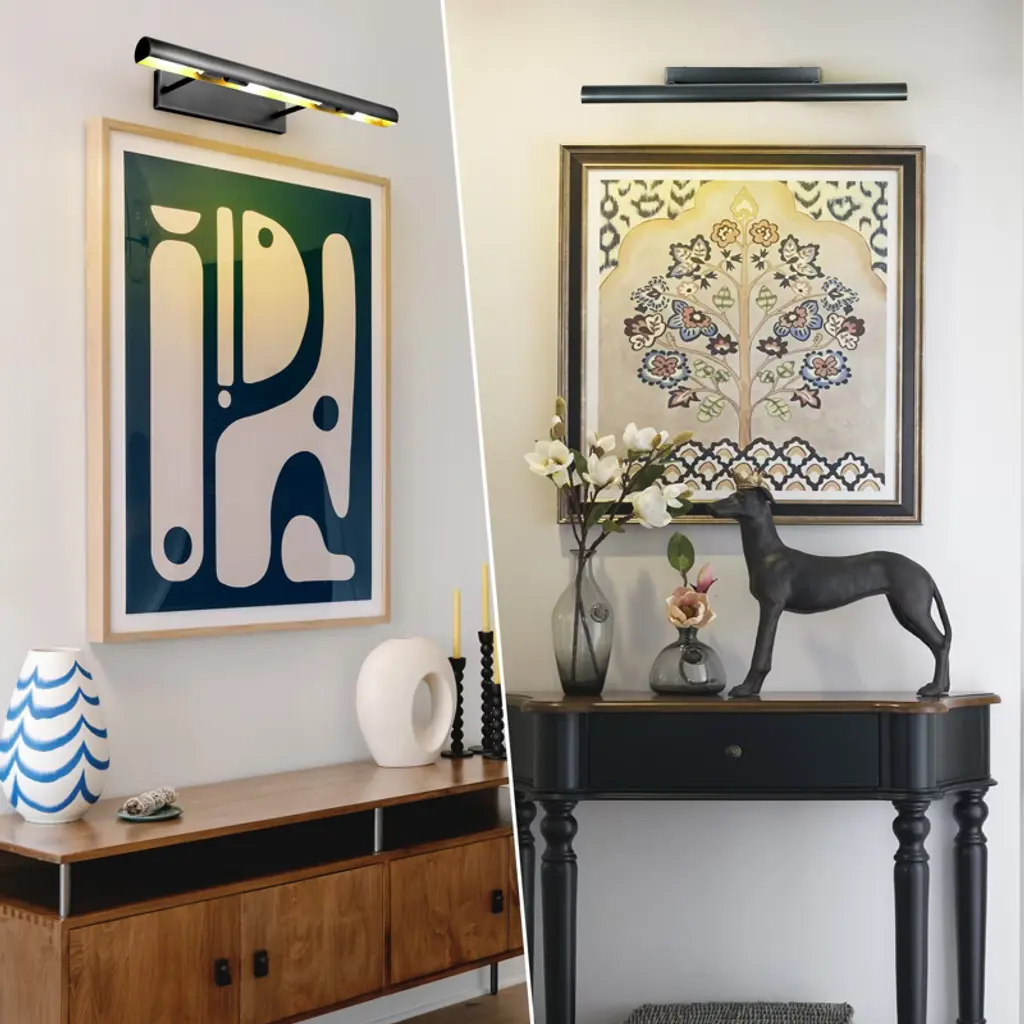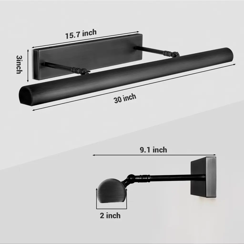 This 30-inch picture light, using one piece molded metal for the casing makes it more sturdy and durable. Designed to illuminate your artwork beautifully, this light features an adjustable angle, allowing you to direct the light precisely where it's needed to enhance the details and of your favorite pieces. The high-quality metal construction ensures a sturdy, corrosion-resistant, and fade-proof fixture that maintains its luster over time. Whether highlighting a cherished painting, photograph, or any wall art, our picture light adds sophistication and functionality to any space. Perfect for galleries, living rooms, hallways, and more, this versatile light will make your artwork shine