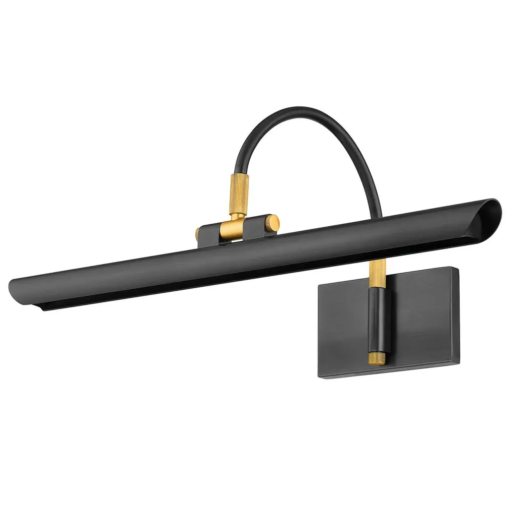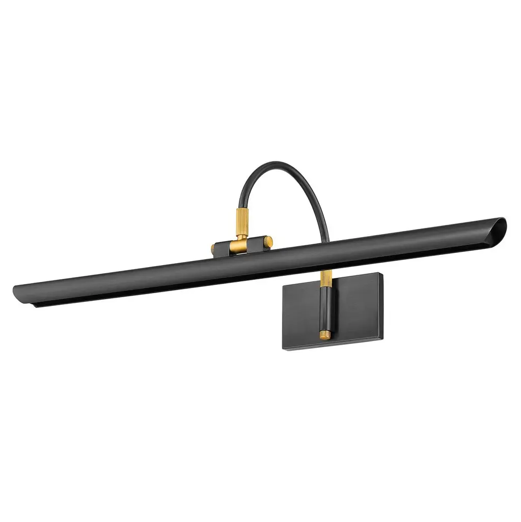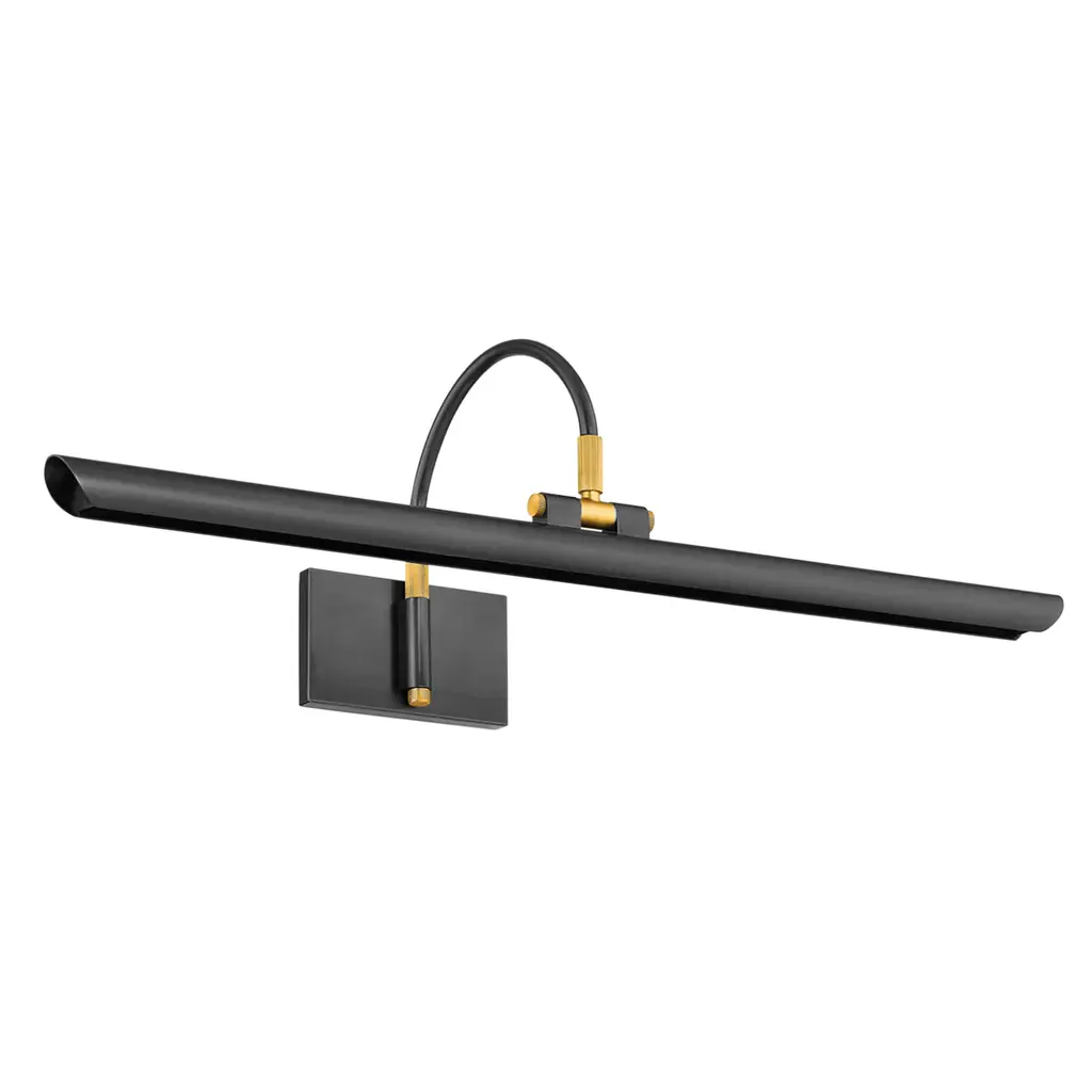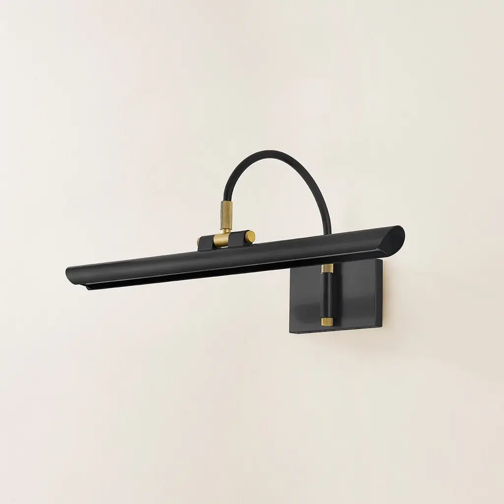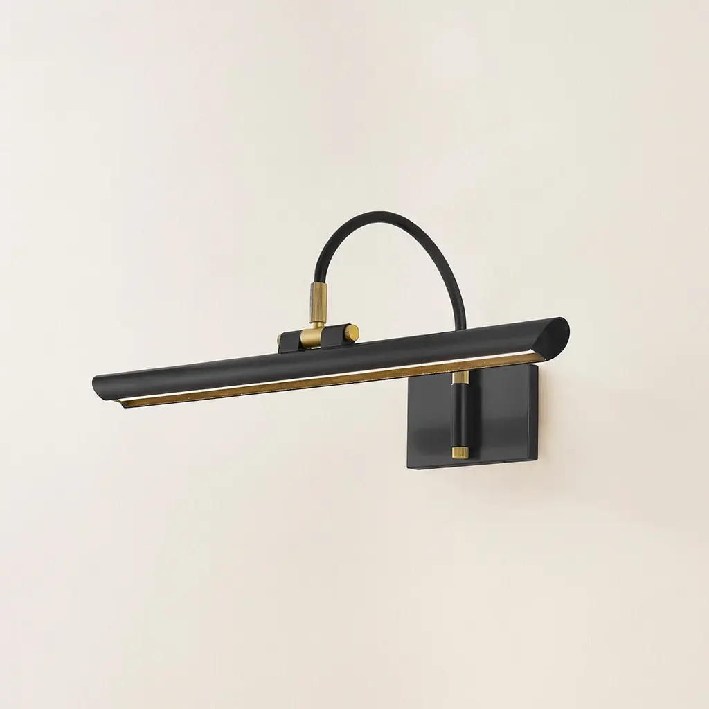 Breathing new life into a classic picture light design, Elowen features a slender silhouette and integrated LED technology. Supported by an arched neck, the shade is folded into a tube, leaving a thin opening that allows a band of light to pass through. Available in two sizes in either an Aged Brass or an Aged Old Bronze finish, Elowen provides discreet, yet powerful illumination of wall decor.