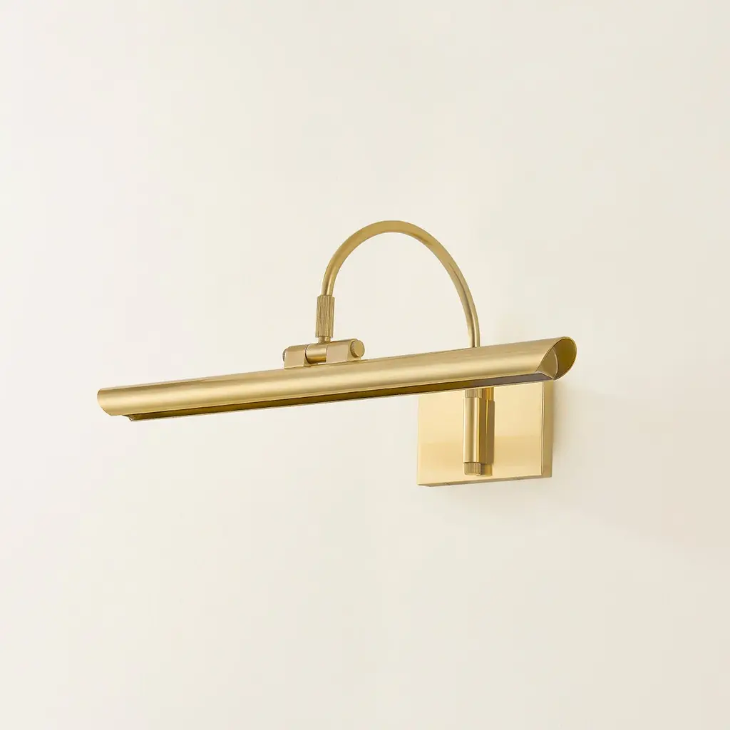 Breathing new life into a classic picture light design, Elowen features a slender silhouette and integrated LED technology. Supported by an arched neck, the shade is folded into a tube, leaving a thin opening that allows a band of light to pass through. Available in two sizes in either an Aged Brass or an Aged Old Bronze finish, Elowen provides discreet, yet powerful illumination of wall decor.
