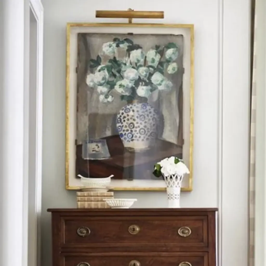 The beloved Visual Comfort Signature, formerly known as Visual Comfort, brand and designer duo Chapman & Myers have joined forces to create the Frame Makers 18 inch Picture Light, a contemporary steel structure with minimal profile and adjustable arm. The sole purpose of this piece is to cast a focused direction of light onto the wall surface below. Whether it be a framed work of art or a family heirloom portrait, it will illuminate the subject beautifully.