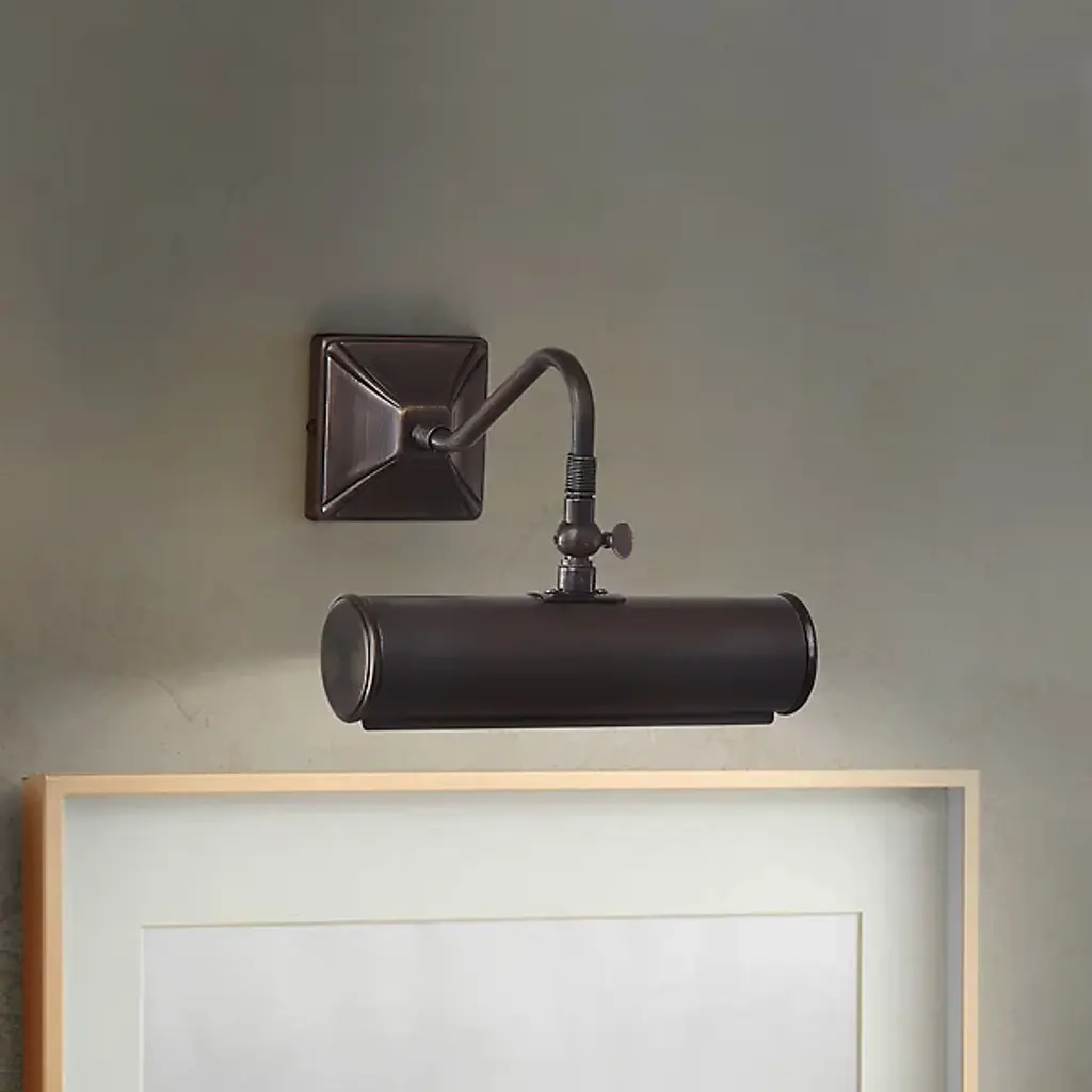 The Leo Picture Light from Lucas McKearn defines one’s wall-hung pictures with even lighting and an understated design. This transitional piece gives off an antique style through its hardware detailing. Mounting with a beveled backplate, a slender arm comes forward with a joint mechanism that allows the lamp head to tilt up and down. While lit, the long lamp head eliminates glare while giving a clean, soft glaze to one’s framed art pieces.