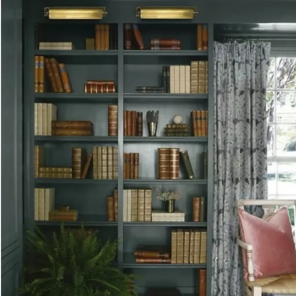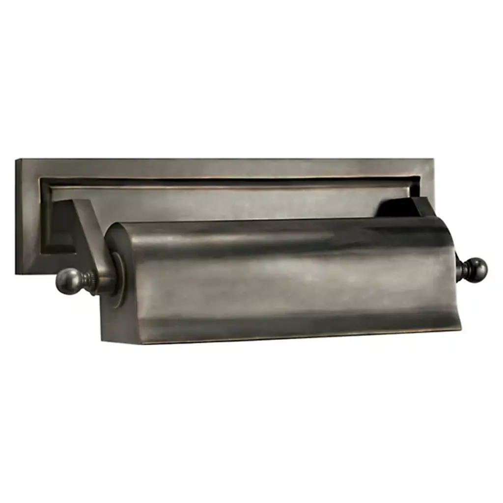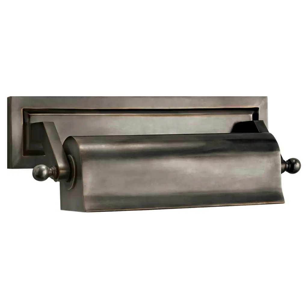 Old school elegance and functional prowess are in store with the defining design of the Library Picture Light from Visual Comfort Signature, formerly known as Visual Comfort, This piece’s metal construction says permanence like traditional fixtures. It plants securely to the wall with a slender backplate. The backplate slides in between tight architectural features with a compact shape. Leaning forward, the piece features a joint mechanism to aim the light below. The half-cylindrical lamp head covers the tubular light source partially to block front-facing glare. The tubular light source fans out a uniform glow best served for artwork or décor.