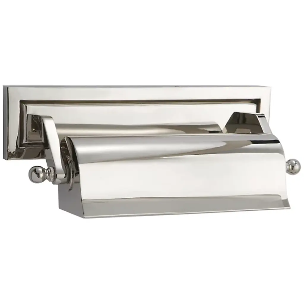 Old school elegance and functional prowess are in store with the defining design of the Library Picture Light from Visual Comfort Signature, formerly known as Visual Comfort, This piece’s metal construction says permanence like traditional fixtures. It plants securely to the wall with a slender backplate. The backplate slides in between tight architectural features with a compact shape. Leaning forward, the piece features a joint mechanism to aim the light below. The half-cylindrical lamp head covers the tubular light source partially to block front-facing glare. The tubular light source fans out a uniform glow best served for artwork or décor.