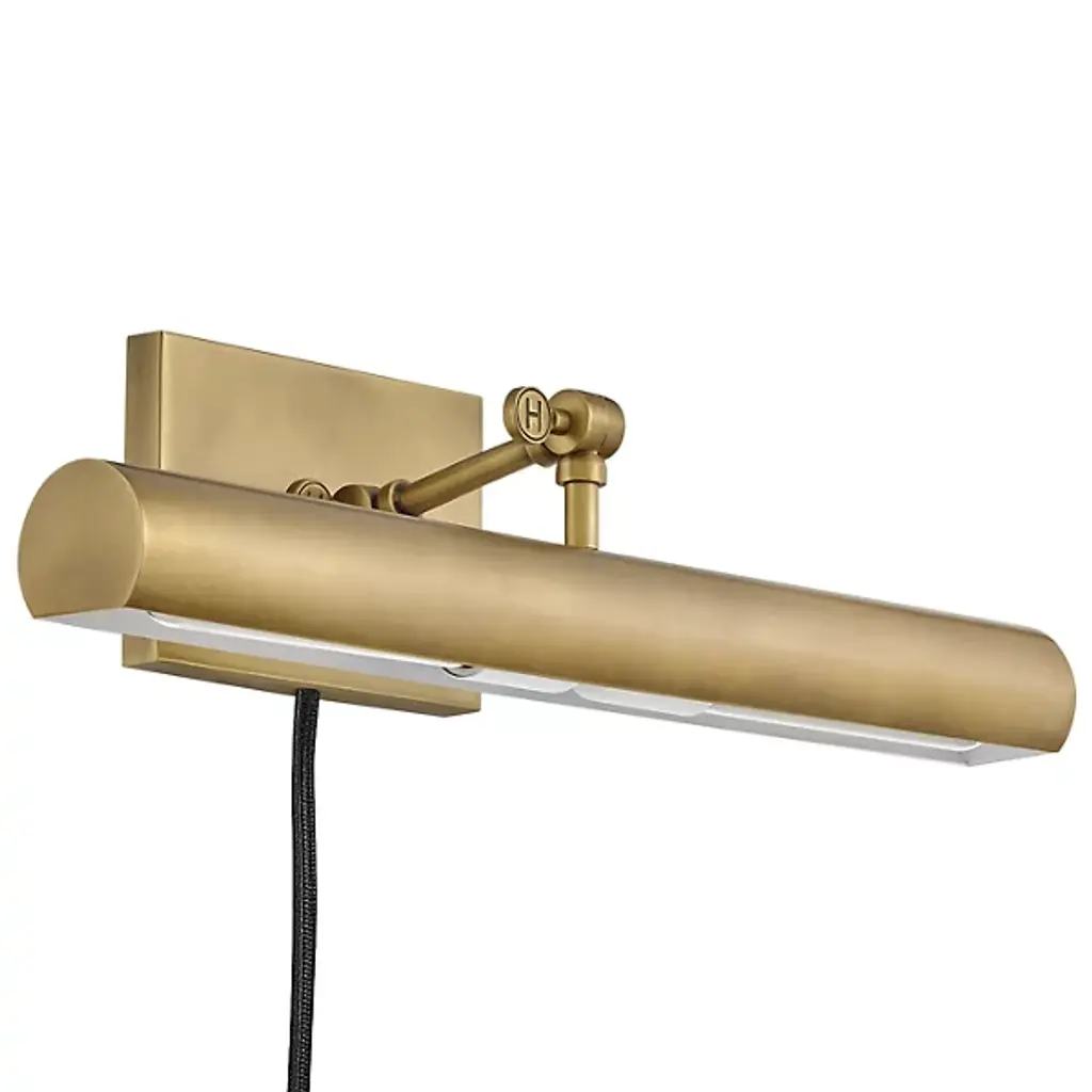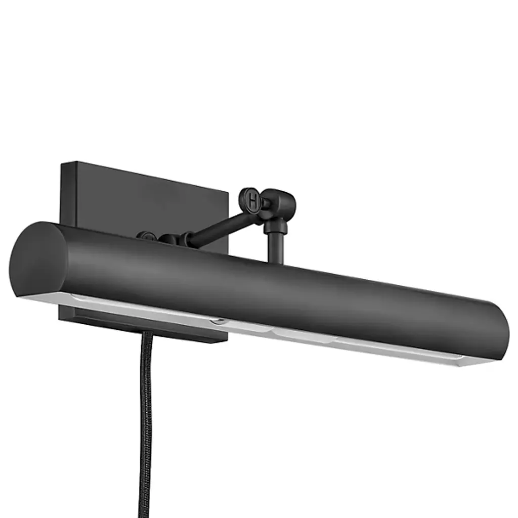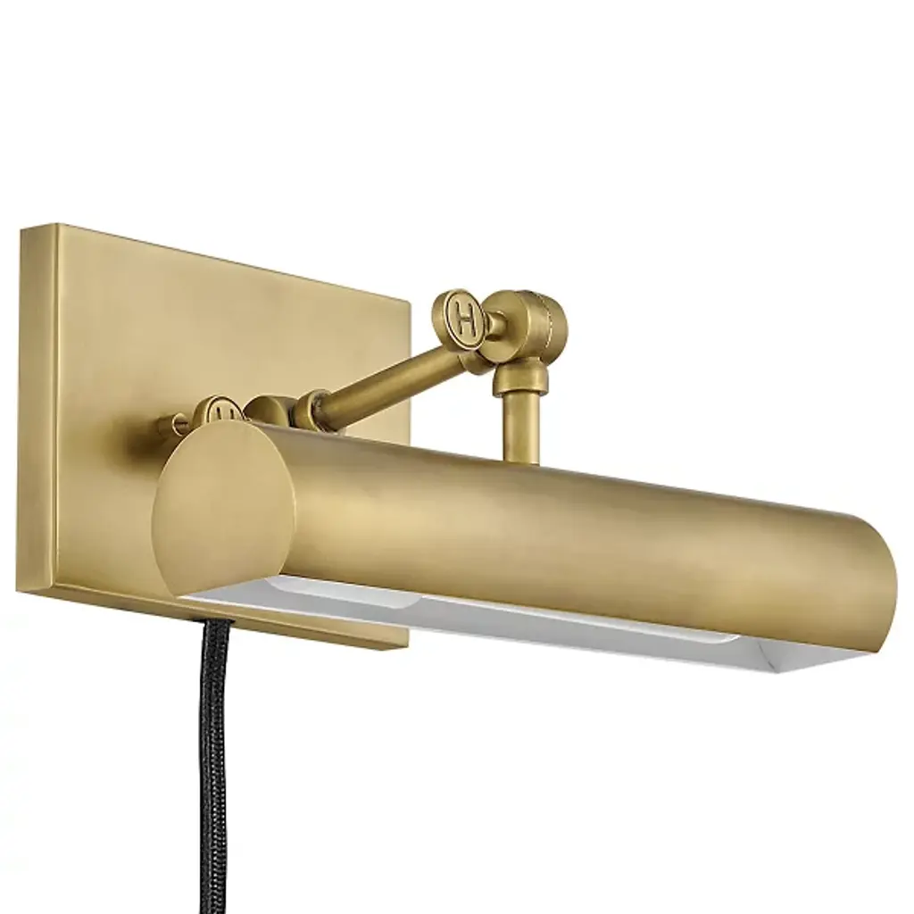 Add inspired style and flexibility to interiors with the striking lines of the Stokes Picture Light from Hinkley Lighting. A charming vintage design with intricate elements extending from a steel wall plate via a slim, double-jointed arm, it sets expressive lamping under a long, posable hood, ideal for illuminating wall art. The curving metal shape obscures light to the sides, transforming it into focused task light accompanied by reflected and ambient warmth.