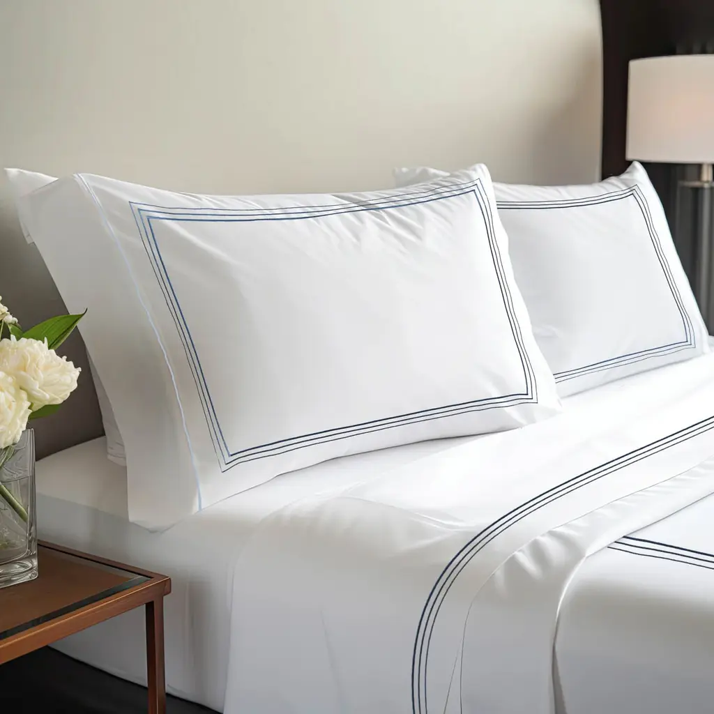 Indulge in the elegance and comfort of the Three Lines Sham from The Lino. This refined bedding piece is crafted with 100% Egyptian cotton and a 400-thread count percale weave, offering a crisp, breathable, and luxuriously soft feel. The fine embroidered lines along the edges add a sophisticated touch, elevating the structure of your bedding. Experience framed sophistication and ultimate comfort with the Three Lines Sham. Highlights