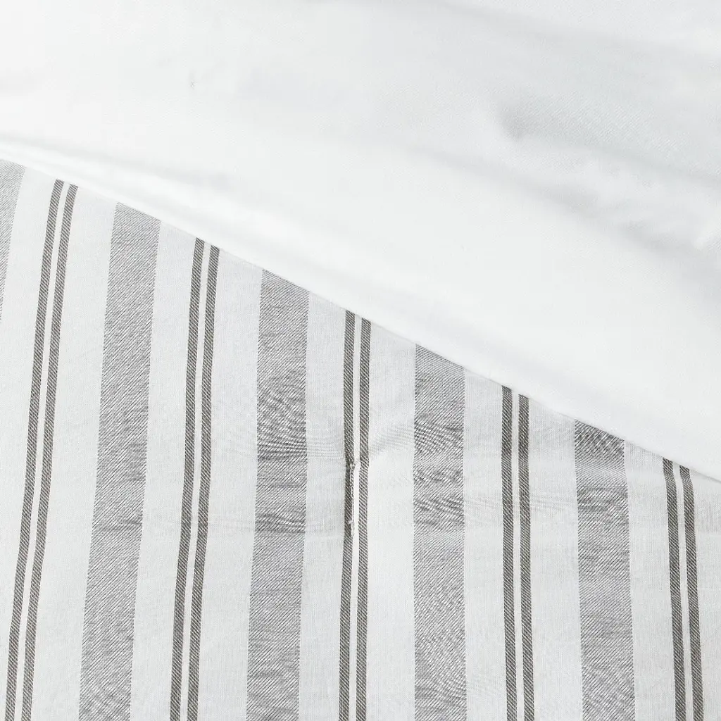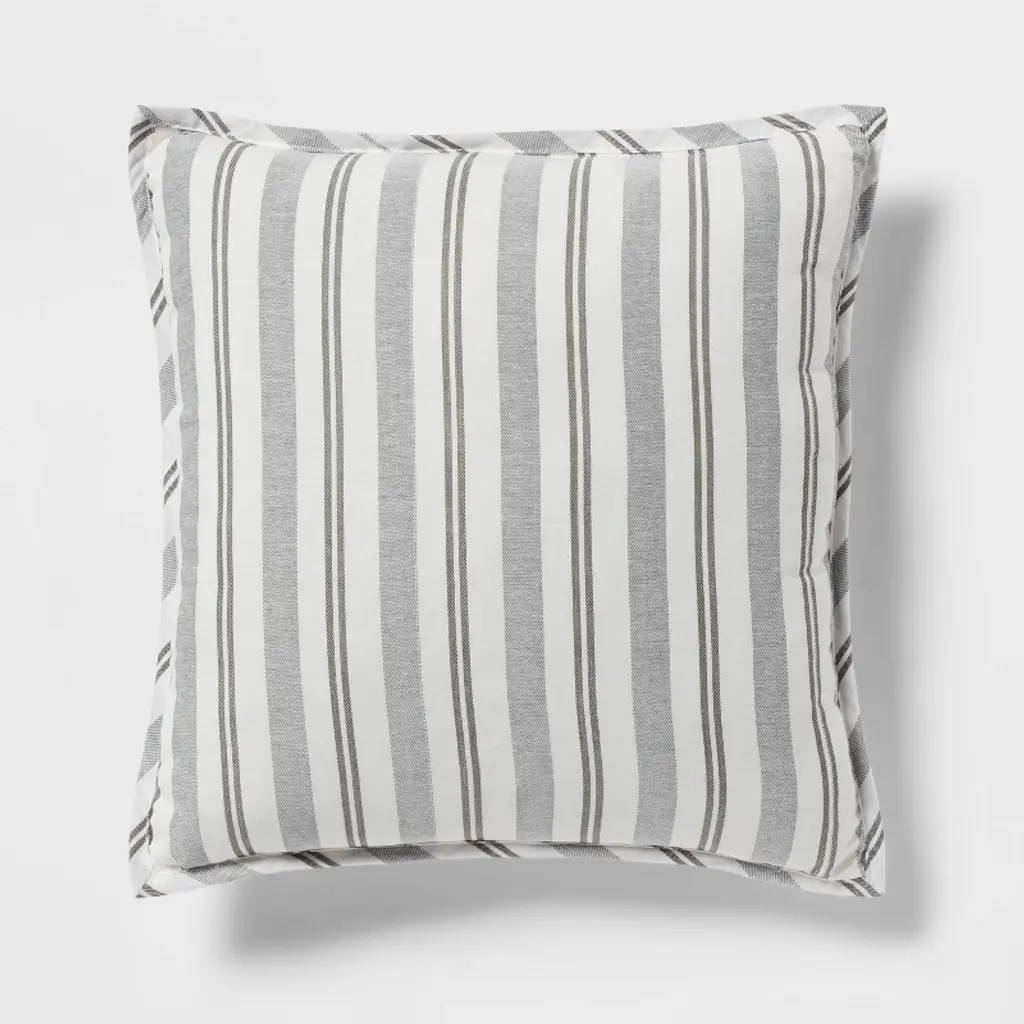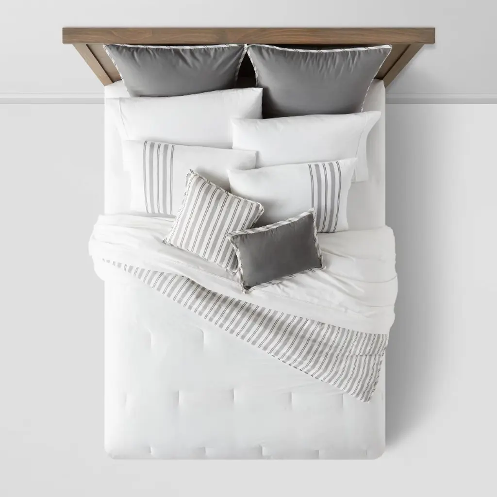 Create a timeless look in your bedroom with the Edenton Reversible Classic Stripe Comforter Set from Threshold™. Made from crisp, soft and breathable percale fabric to keep you comfortable all year round, this multi-piece bedding set includes a comforter, two decorative pillows, two standard shams, two Euro shams and a bedskirt. The bedding set has a soft-filled comforter with tack-stitch quilting and a striped pattern in white and gray. Plus, the bedskirt and two decorative pillows with either striped pattern or solid design with striped piping serve as chic accents to this reversible bedding set.