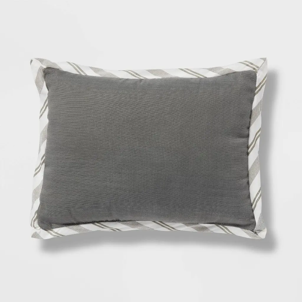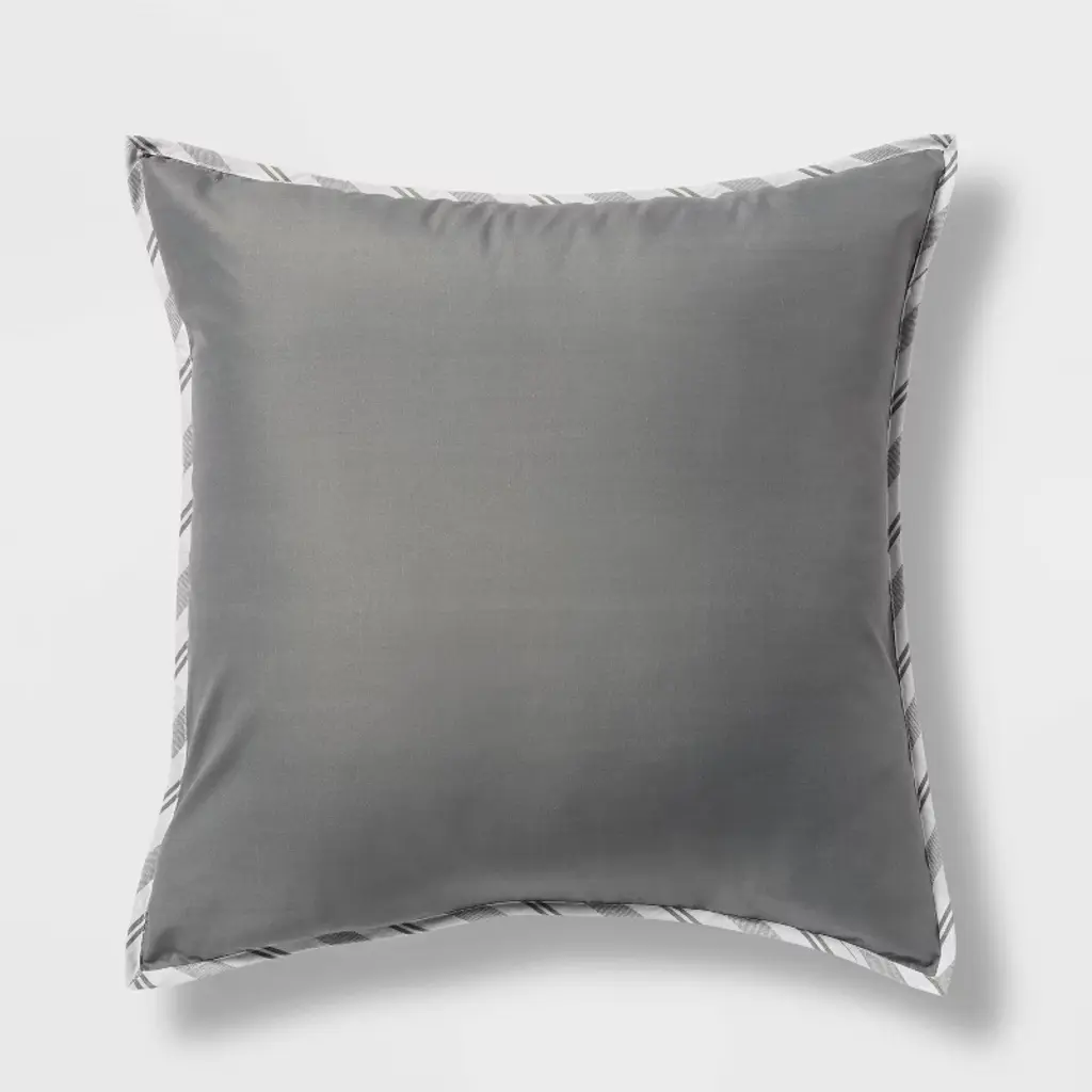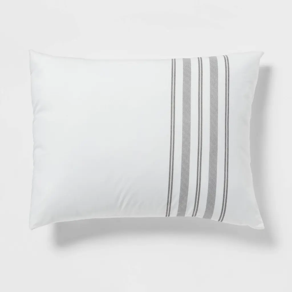 Create a timeless look in your bedroom with the Edenton Reversible Classic Stripe Comforter Set from Threshold™. Made from crisp, soft and breathable percale fabric to keep you comfortable all year round, this multi-piece bedding set includes a comforter, two decorative pillows, two standard shams, two Euro shams and a bedskirt. The bedding set has a soft-filled comforter with tack-stitch quilting and a striped pattern in white and gray. Plus, the bedskirt and two decorative pillows with either striped pattern or solid design with striped piping serve as chic accents to this reversible bedding set.