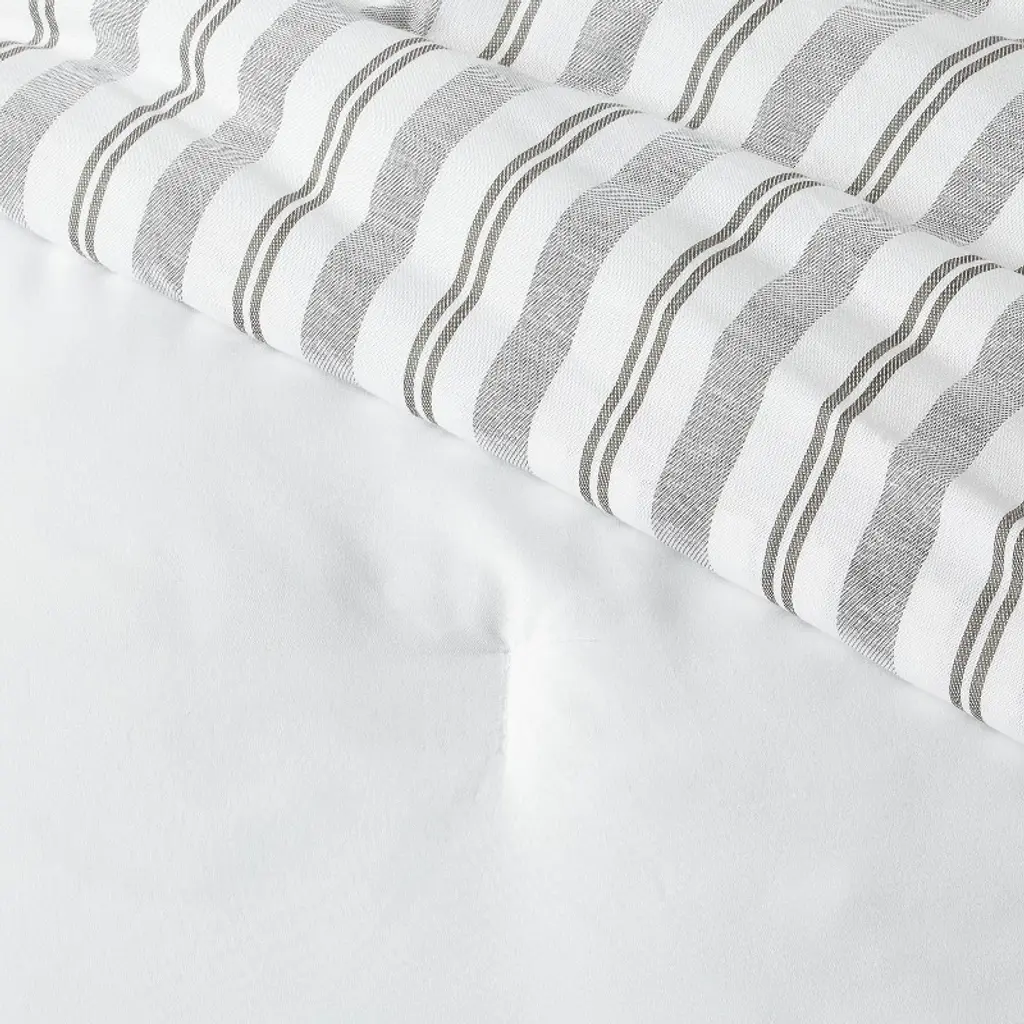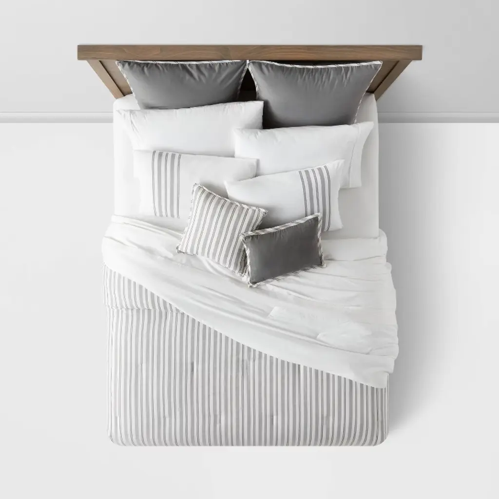 Create a timeless look in your bedroom with the Edenton Reversible Classic Stripe Comforter Set from Threshold™. Made from crisp, soft and breathable percale fabric to keep you comfortable all year round, this multi-piece bedding set includes a comforter, two decorative pillows, two standard shams, two Euro shams and a bedskirt. The bedding set has a soft-filled comforter with tack-stitch quilting and a striped pattern in white and gray. Plus, the bedskirt and two decorative pillows with either striped pattern or solid design with striped piping serve as chic accents to this reversible bedding set.