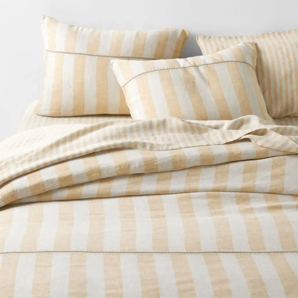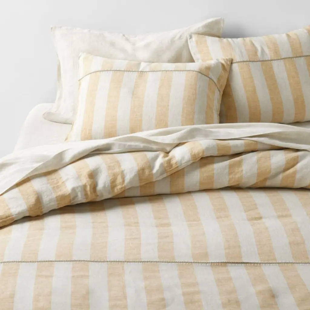 Our breezy cabana stripe pillow sham transforms your bed into a coastal oasis. Classic cabana stripes get a modern update in muted yellow and creamy tan, offset and rejoined with an exquisitely embroidered piecing seam. The sustainable linen sham joins the matching duvet and coordinating sheets from our linen collection to make a laid-back, beachy bed.Bed pillows also available.