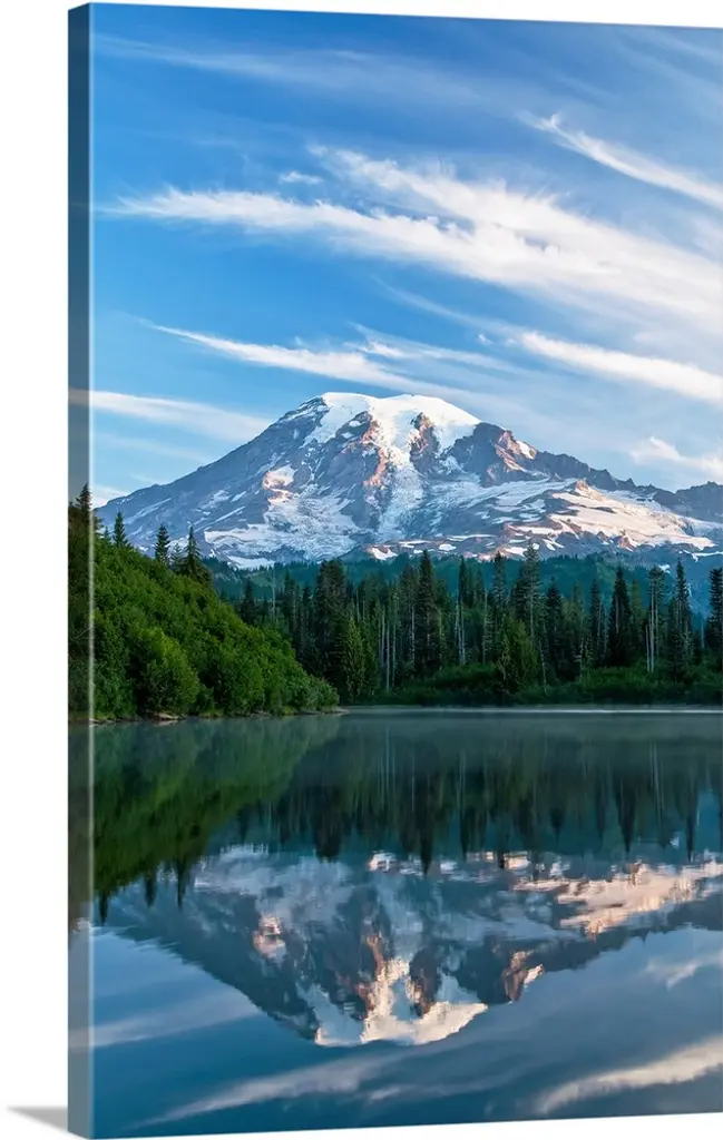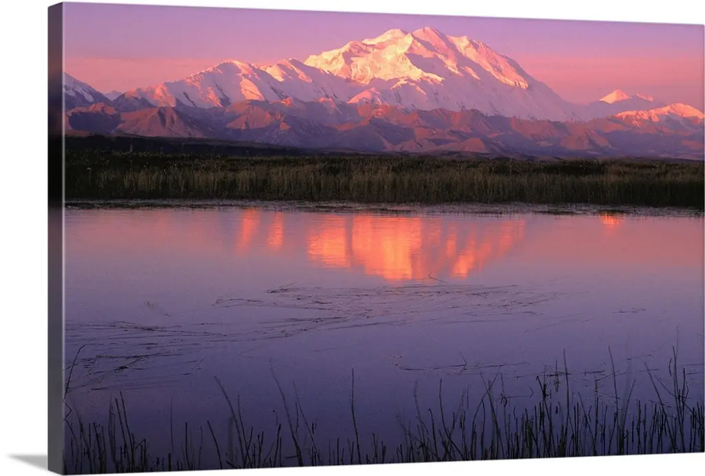 USA, Alaska, Denali National Park. Mt. McKinley (Denali), showing the north face of Denali "Wickersham Wall," reflected in a tundra pond.
