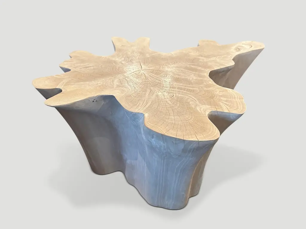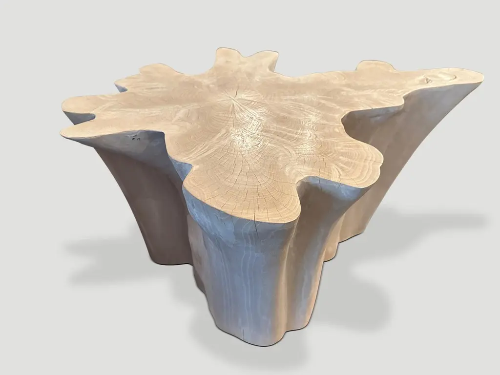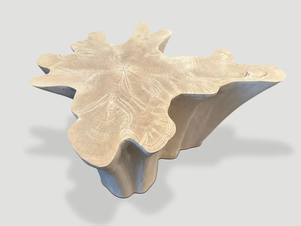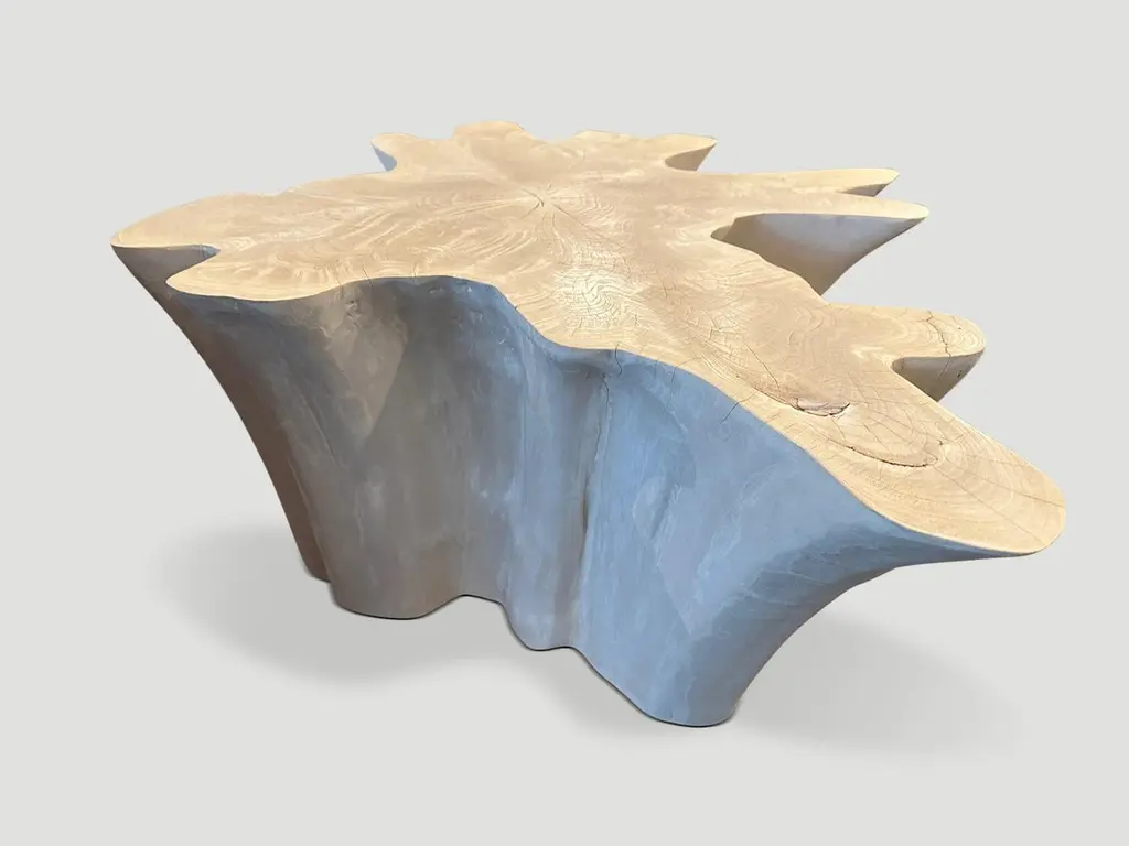 Impressive reclaimed bleached teak amorphous coffee table. A slight graduation from the bottom to the top. We have added a polish to the top for a slight bone contrast and protection revealing the beautiful wood grain.The St. Barts Collection features an exciting line of organic white wash, bleached and natural weathered teak furniture. The reclaimed teak is bleached and left to bake in the sun and sea salt air for over a year to achieve this unique finish. Select pieces are infused with a brilliant aqua or soft blue resin that is cracked to achieve a unique quartz crystal effect. The final result evokes imagery of the white sand beaches and brilliant aqua waters of the famous French Caribbean Island.Own an Andrianna Shamaris original.Andrianna Shamaris. The Leader In Modern Organic Design.