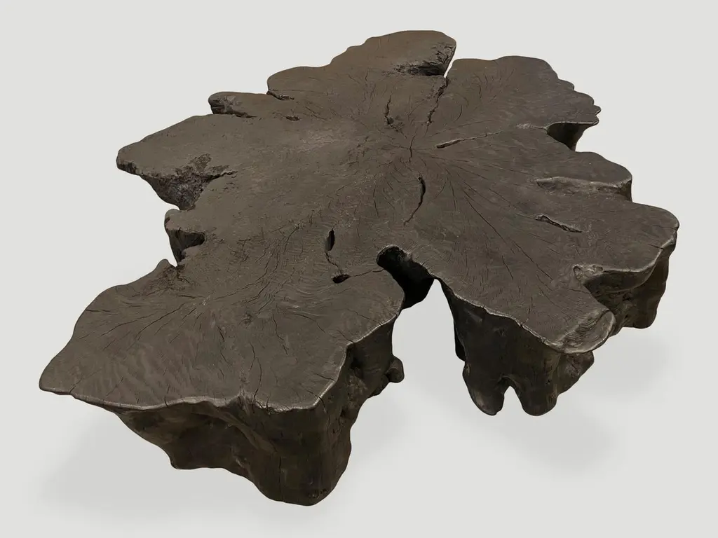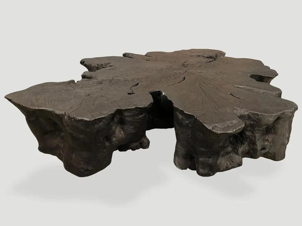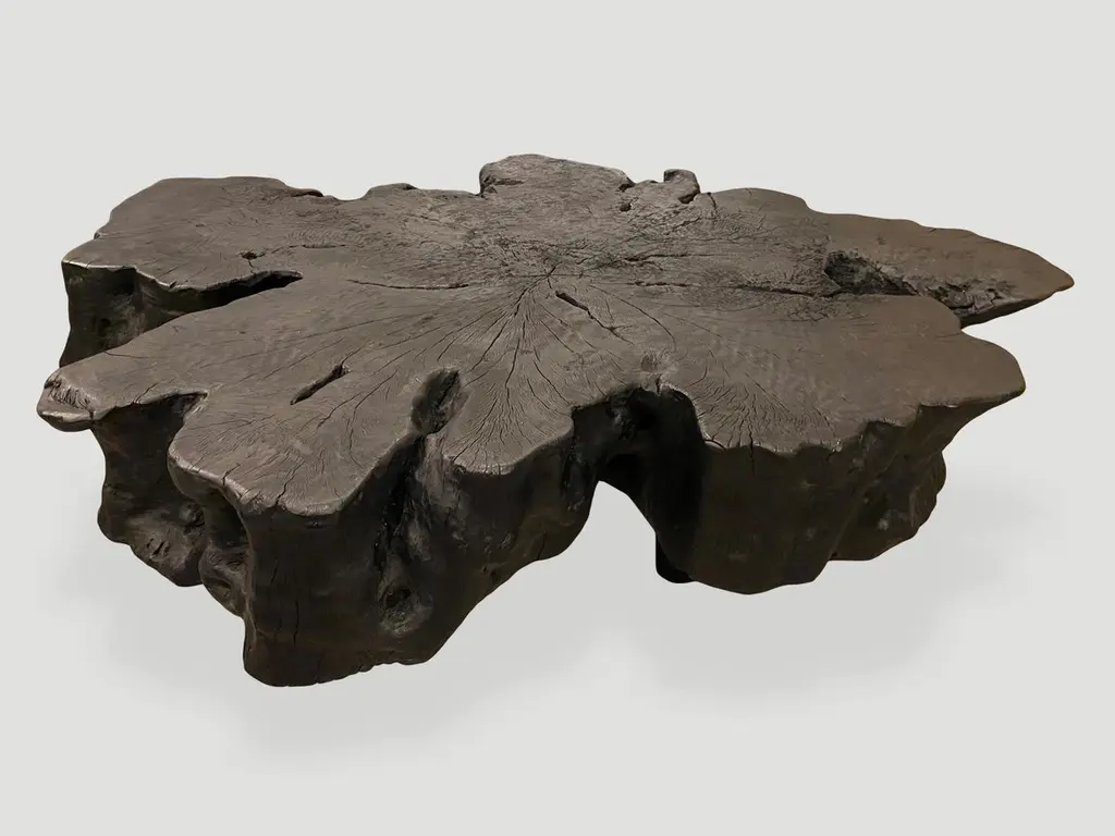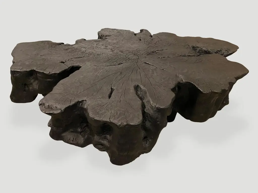 Hand carved reclaimed lychee root coffee table floating 8" off the floor. A slight graduation from the bottom to the top of this stunning 8" slab. Burnt, sanded and sealed exposing the beautiful grain in this charred wood. Custom stains and finishes available.The Triple Burnt Collection represents a unique line of modern furniture made from solid organic wood. Burnt three times to produce a rich, charcoal finish with impressive depth-a result unachievable using standard stains and finishes. A perfect combination of modern and organic.Own an Andrianna Shamaris original.Andrianna Shamaris. The Leader In Modern Organic Design.