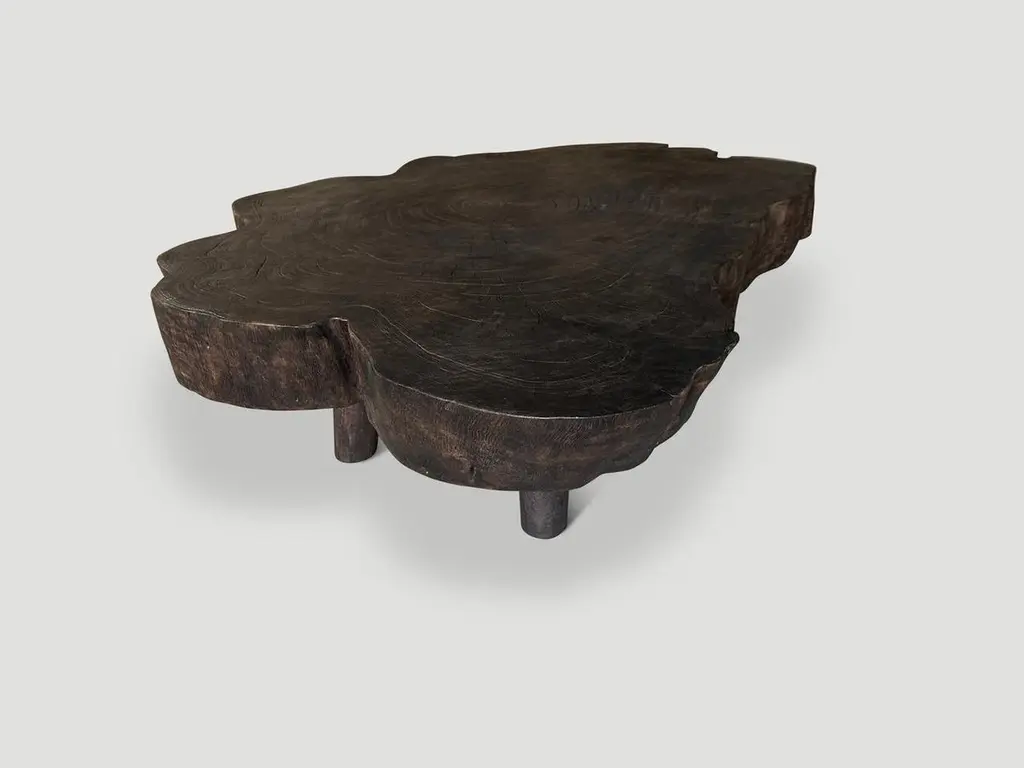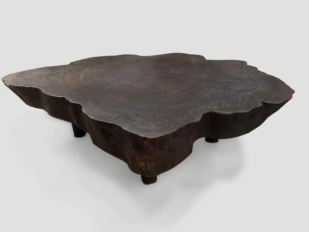 Impressive reclaimed five inch slab mango root coffee table, floating on minimalist cone legs. Charred, sanded and sealed revealing the beautiful wood grain. All one of a kind in the same style. Custom finishes available. Please inquire.The Triple Burnt Collection represents a unique line of modern furniture made from solid organic wood. Burnt three times to produce a rich, charcoal finish with impressive depth-a result unachievable using standard stains and finishes. A perfect combination of modern and organic. The coffee table shown was charred one time to a beautiful chocolate tone. It’s all in the details.Own an Andrianna Shamaris original.Andrianna Shamaris. The Leader in Modern Organic Design.