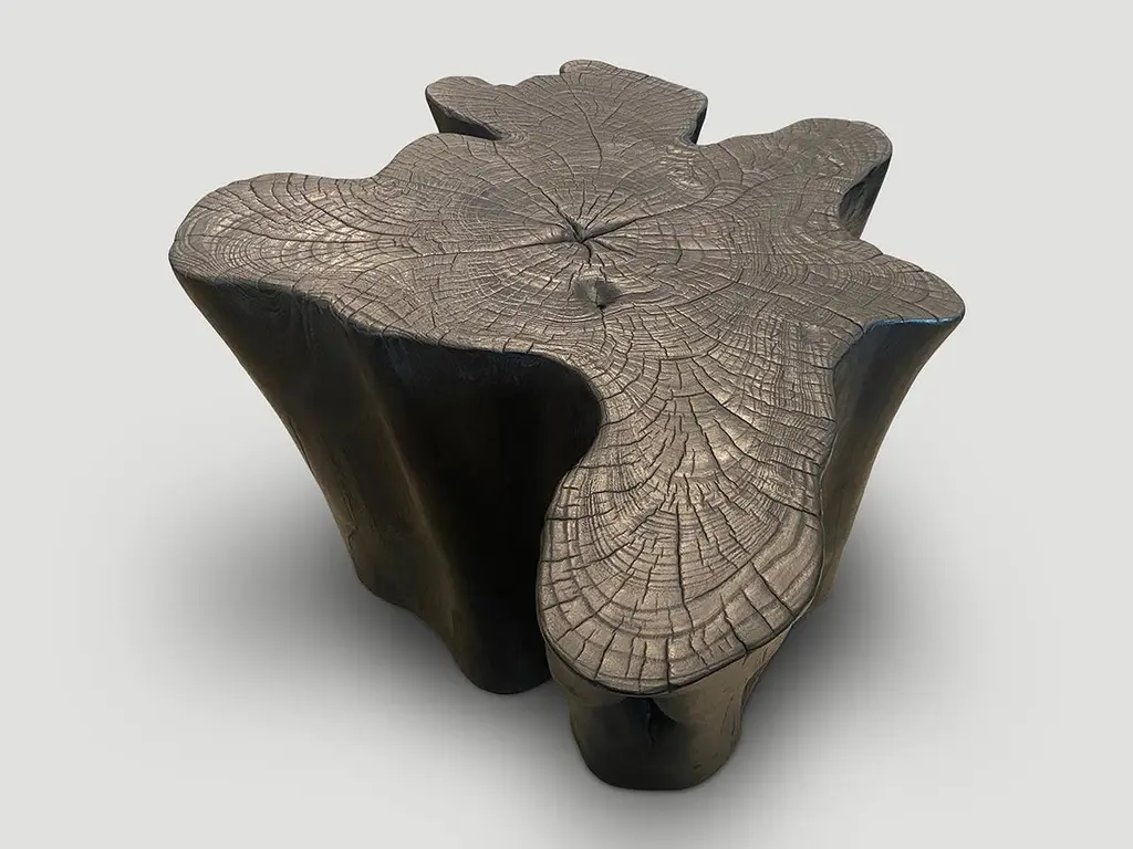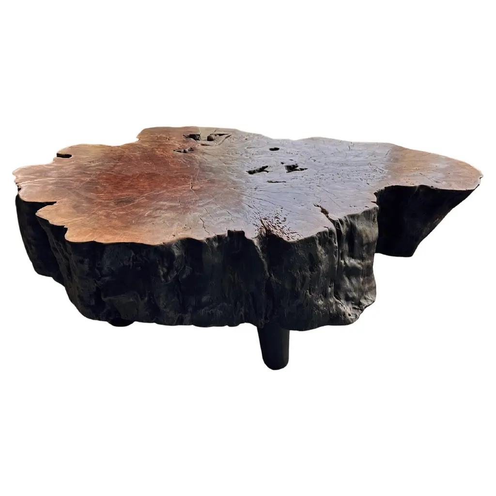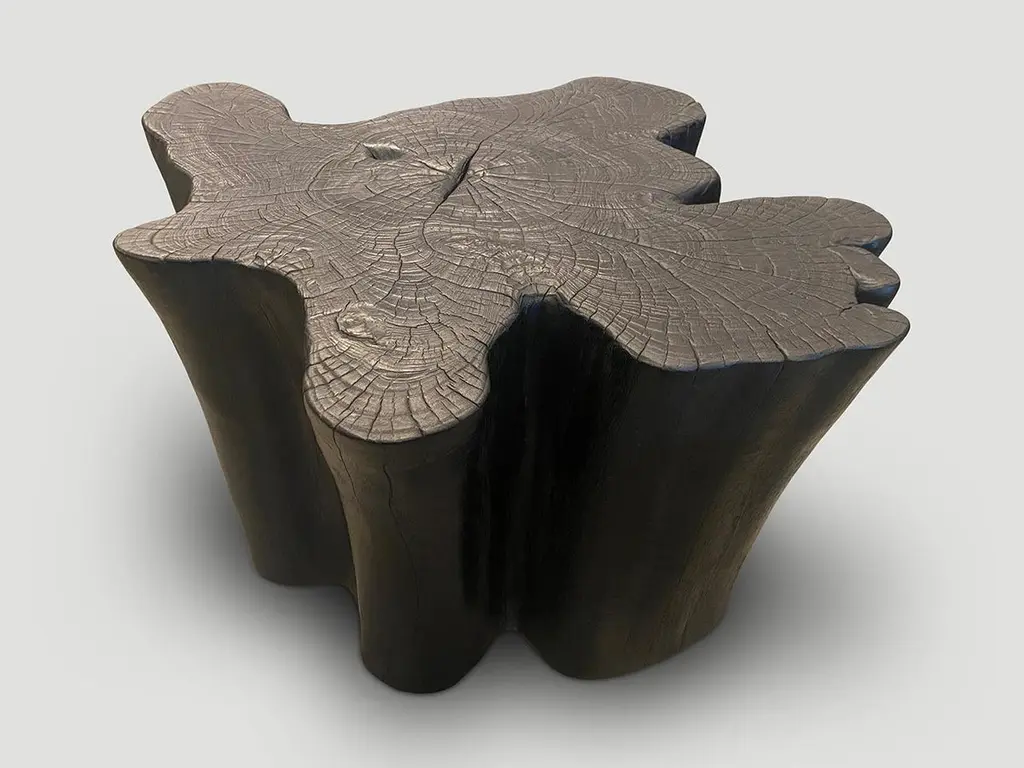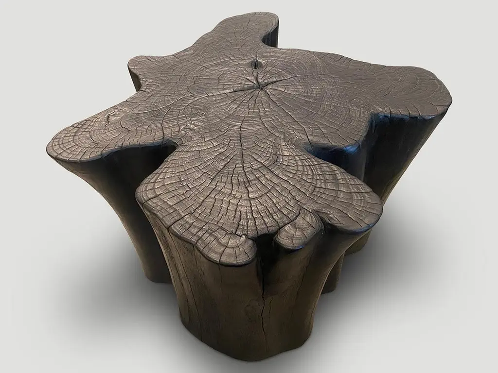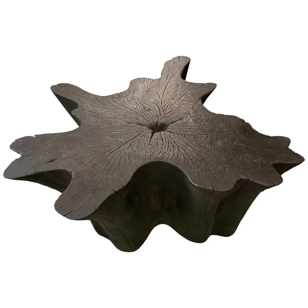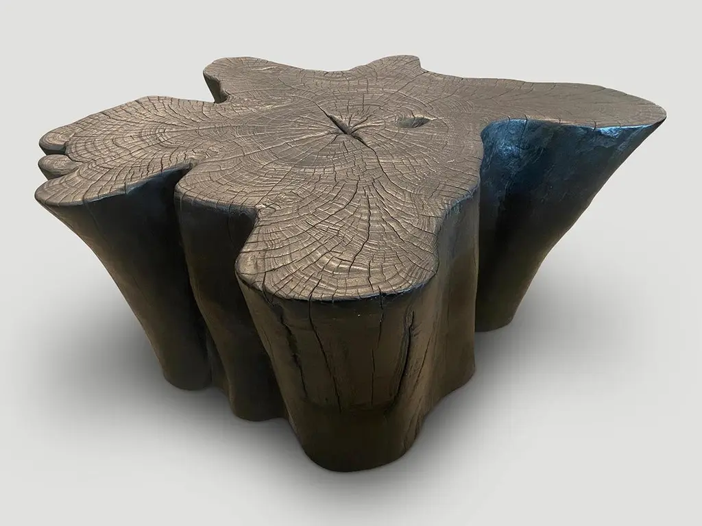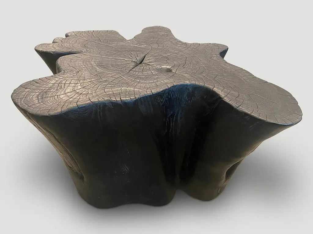 Charred coffee table hand carved from a single reclaimed teak root. A slight graduation from the bottom to the top. Charred, sanded and sealed revealing the beautiful wood grain. We have a collection that can be placed together for a larger modular coffee table. Please inquire.The Triple Burnt Collection represents a unique line of modern furniture made from solid organic wood. Burnt three times to produce a rich, charcoal finish with impressive depth-a result unachievable using standard stains and finishes. A perfect combination of modern and organic.Own an Andrianna Shamaris original.Andrianna Shamaris. The Leader In Modern Organic Design.