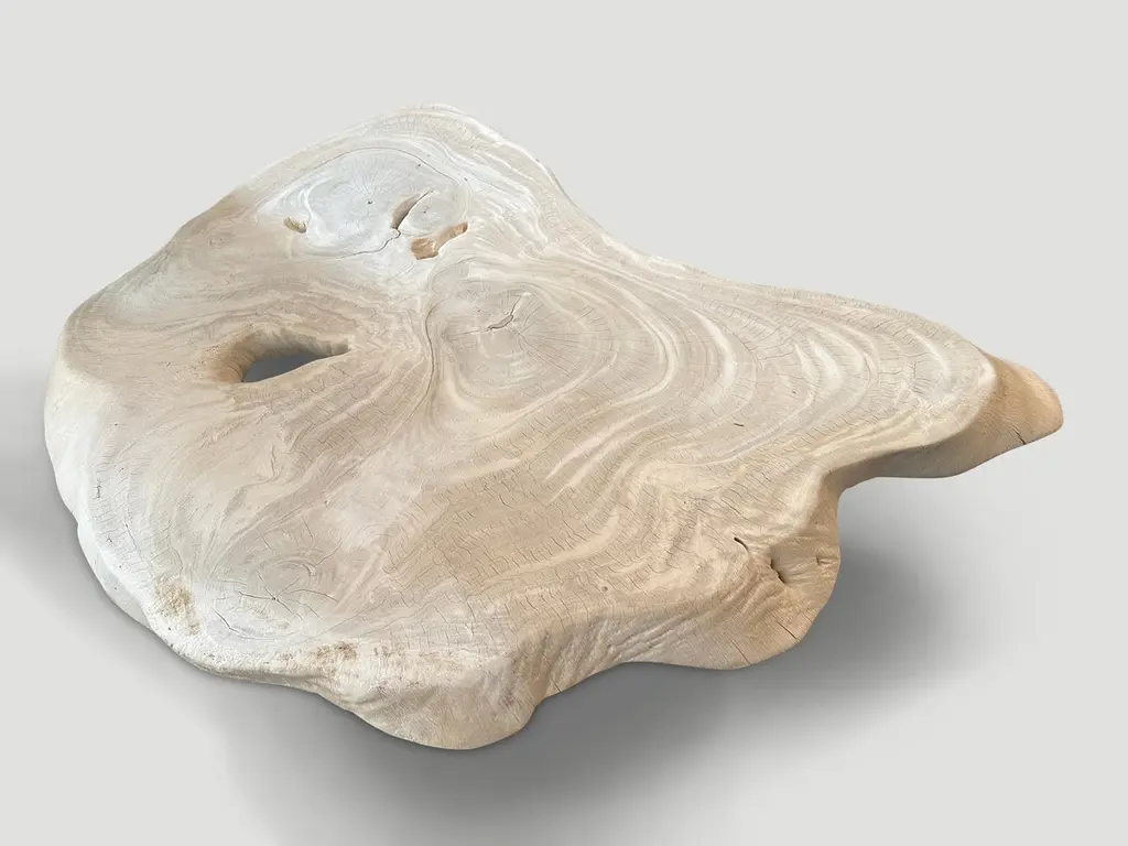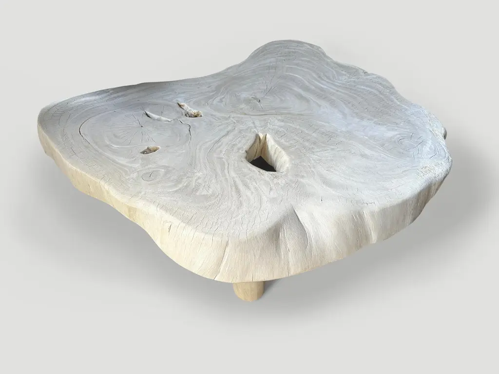Impressive four inch single slab reclaimed suar wood coffee table. Fully bleached revealing the beautiful wood grain. Floating on mid century style cone legs. It’s all in the details. Full dimensions; 65 x 53 x 16" high is measured diagonally x measured across 56 x 46 x 16" high.The St. Barts Collection features an exciting line of organic white wash, bleached and natural weathered wood furniture. The reclaimed wood is bleached and left to bake in the sun and sea salt air for over a year to achieve this unique finish. Select pieces are infused with a brilliant aqua resin that is cracked to achieve a unique quartz crystal effect. The final result evokes imagery of the white sand beaches and brilliant aqua waters of the famous French Caribbean Island.Own an Andrianna Shamaris original.Andrianna Shamaris. The Leader In Modern Organic Design.