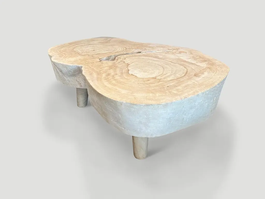 Impressive seven inch single slab reclaimed suar wood coffee table. Fully bleached revealing the beautiful wood grain. Floating on mid century style cone legs. It’s all in the details.The St. Barts Collection features an exciting line of organic white wash, bleached and natural weathered wood furniture. The reclaimed wood is bleached and left to bake in the sun and sea salt air for over a year to achieve this unique finish. Select pieces are infused with a brilliant aqua resin that is cracked to achieve a unique quartz crystal effect. The final result evokes imagery of the white sand beaches and brilliant aqua waters of the famous French Caribbean Island.Own an Andrianna Shamaris original.Andrianna Shamaris. The Leader in Modern Organic Design.