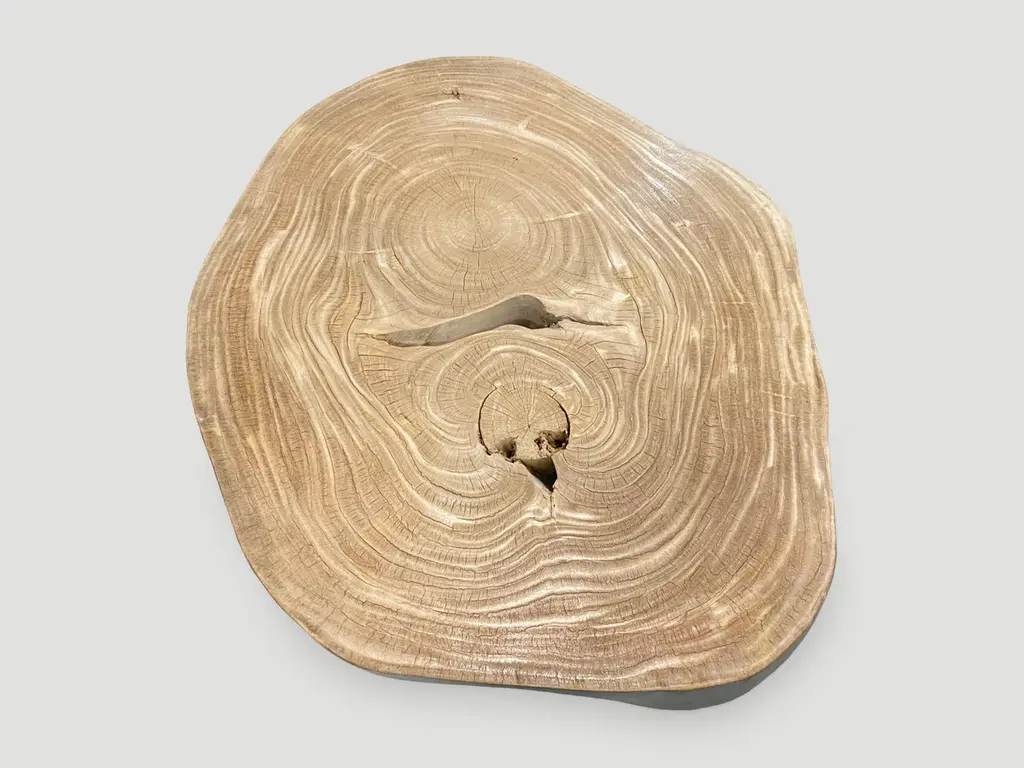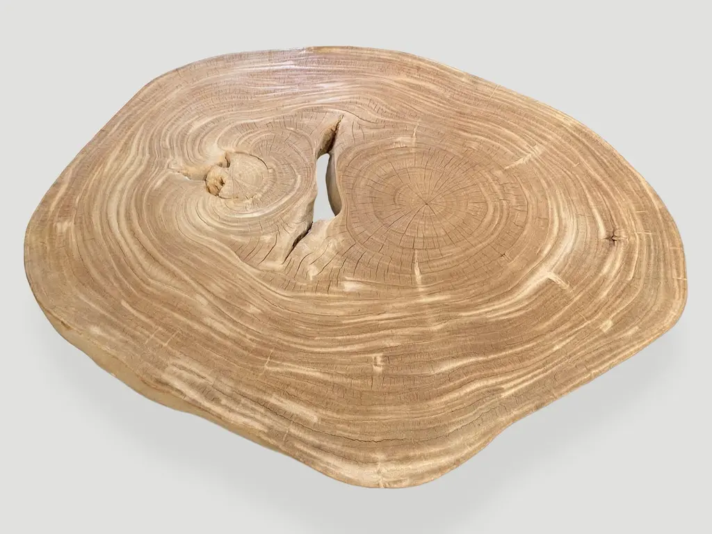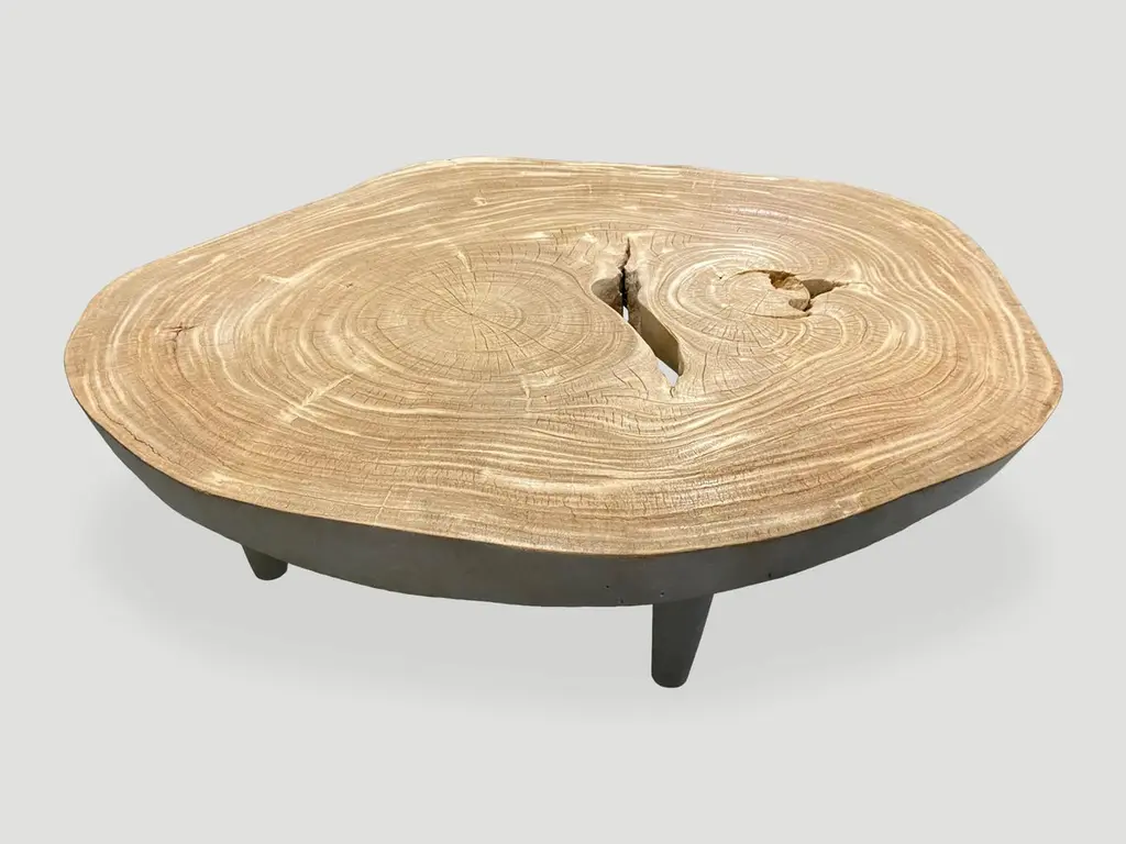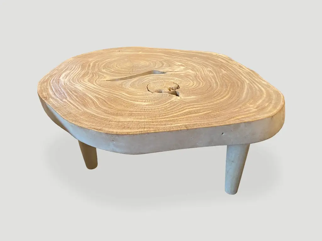 Impressive single slab coffee table, set on cone shaped mid century style legs. The wood is unknown though indigenous to Indonesia. We love the natural way it ‘crackles’ after we applied the bleach to the wood and left in the sun to turn this beautiful ivory tone, exposing the stunning grain of the wood. The St. Barts Collection features an exciting new line of organic white wash, bleached and natural weathered furniture. The reclaimed wood is bleached and left to bake in the sun and sea salt air for over a year to achieve this unique finish. Select pieces are infused with a brilliant aqua or soft blue resin that is cracked to achieve a unique quartz crystal effect. The final result evokes imagery of the white sand beaches and brilliant aqua waters of the famous French Caribbean Island.Own an Andrianna Shamaris original.Andrianna Shamaris. The Leader In Modern Organic Design.