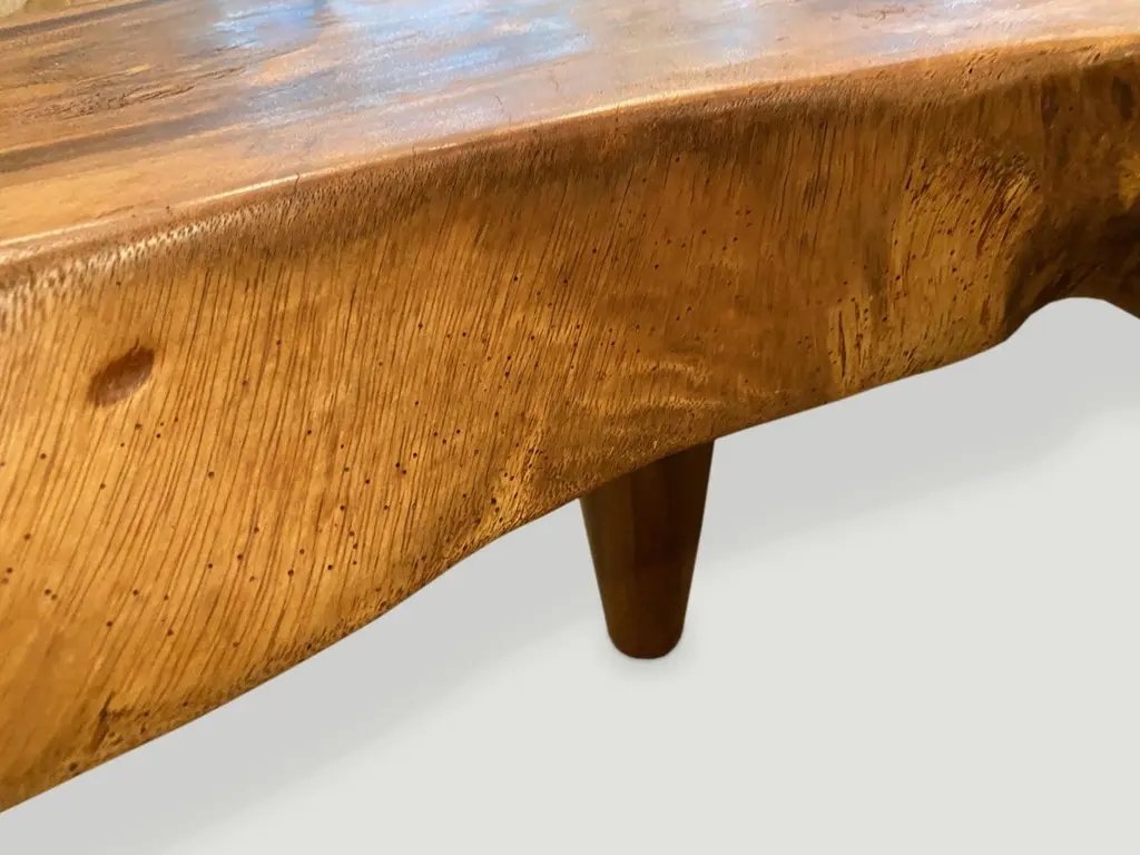 Impressive reclaimed four inch thick slab suar wood coffee table. We added the midcentury style legs and polished the top with a natural oil finish to enhance the grain. Organic is the new modern.Andrianna Shamaris. The Leader In Modern Organic Design.