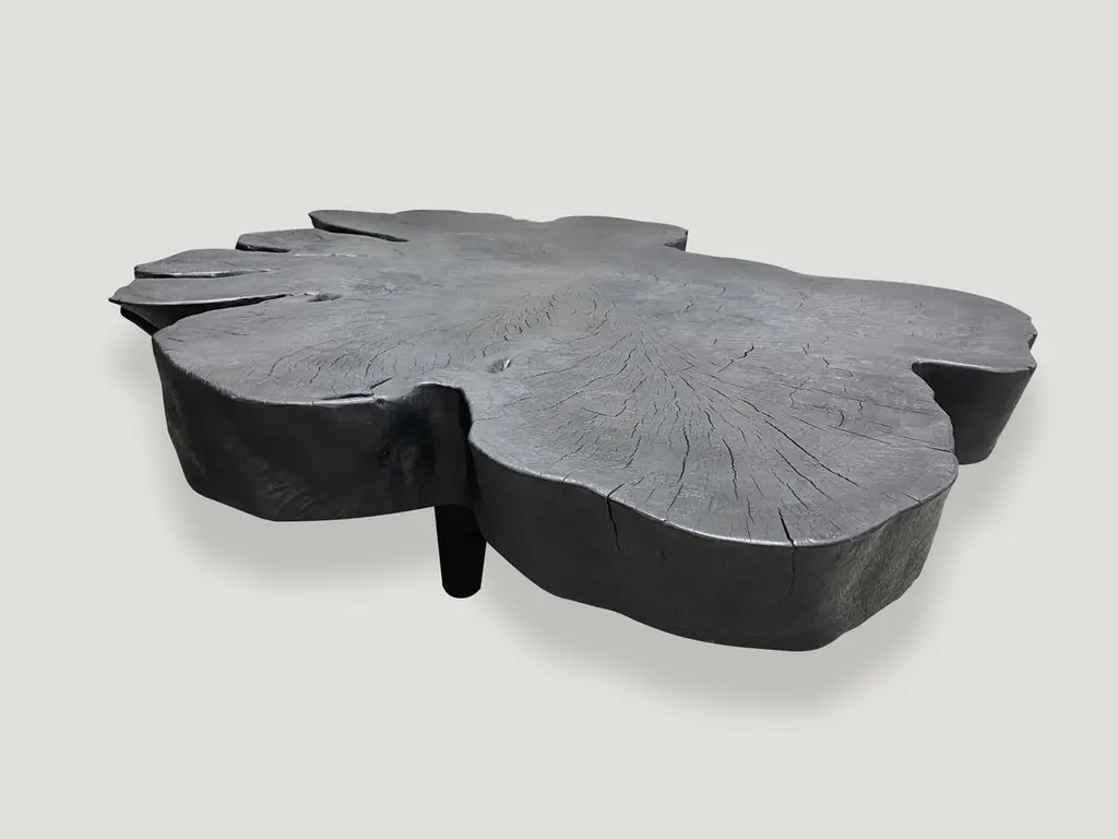 Impressive reclaimed mango wood coffee table made from a six inch single slab. The top floats off the floor on mid century style cone shaped legs. Charred, sanded and sealed exposing the beautiful grain of the wood. Custom finishes available. All one of a kind.The Triple Burnt Collection represents a unique line of modern furniture made from solid organic wood. Burnt three times to produce a rich, charcoal finish with impressive depth-a result unachievable using standard stains and finishes. A perfect combination of modern and organic.Own an Andrianna Shamaris original.Andrianna Shamaris. The Leader In Modern Organic Design.