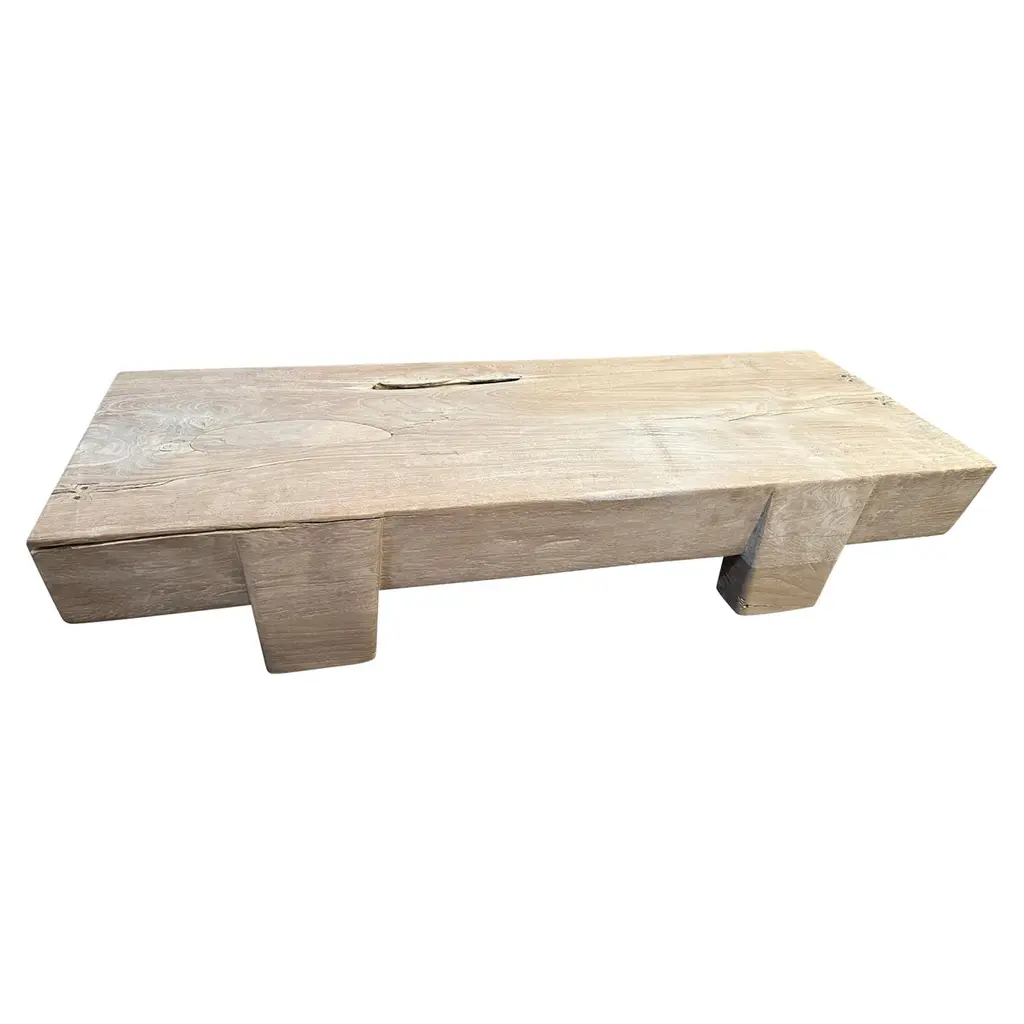 Impressive teak log style bench or coffee table with added Minimalist block legs. Two pieces cut from the same log six inches thick. We added a light white wash revealing the beautiful wood grain.The St. Barts Collection features an exciting new line of organic white wash, bleached and natural weathered teak furniture. The reclaimed teak is bleached and left to bake in the sun and sea salt air for over a year to achieve this unique finish. Select pieces are infused with a brilliant aqua or soft blue resin that is cracked to achieve a unique quartz crystal effect. The final result evokes imagery of the white sand beaches and brilliant aqua waters of the famous French Caribbean Island.Own an Andrianna Shamaris original.Andrianna Shamaris. The Leader In Modern Organic Design.