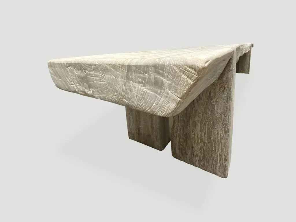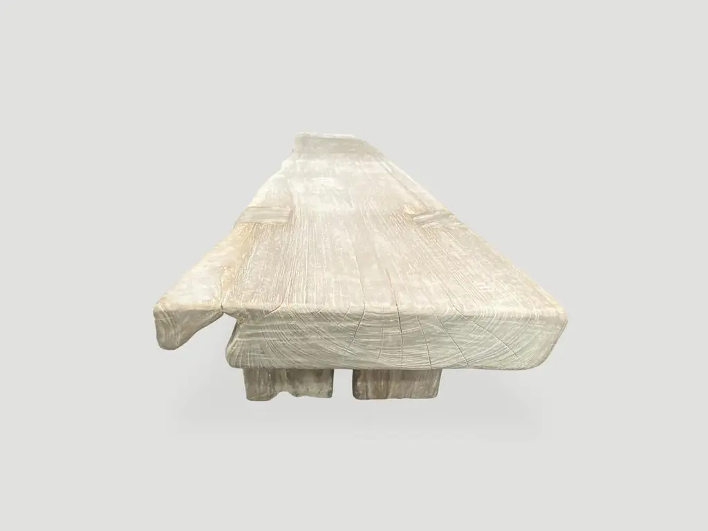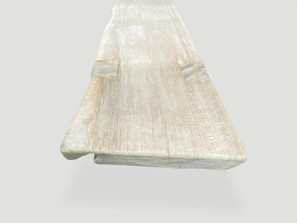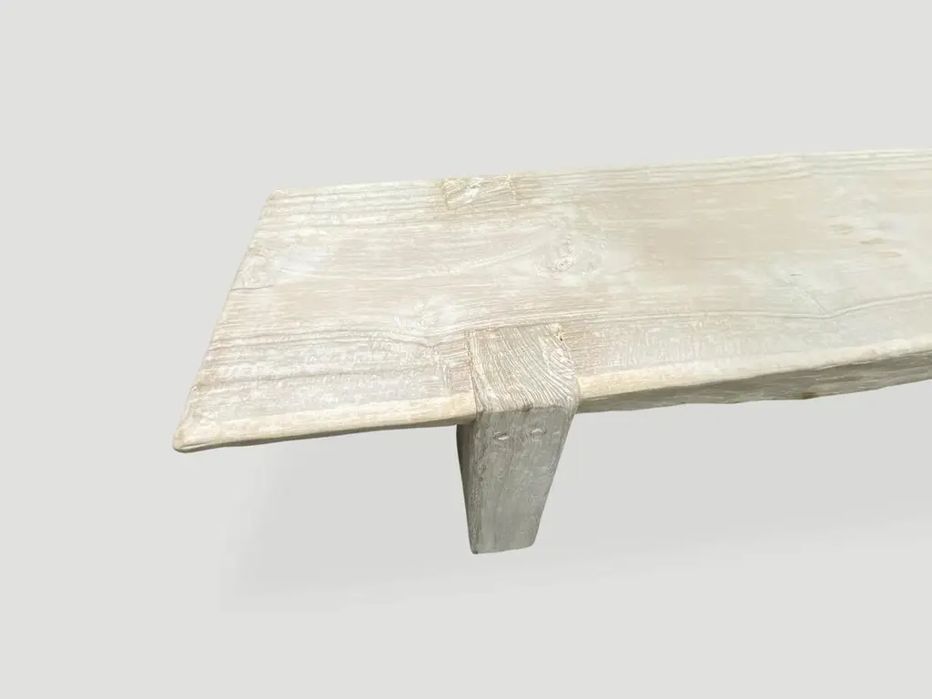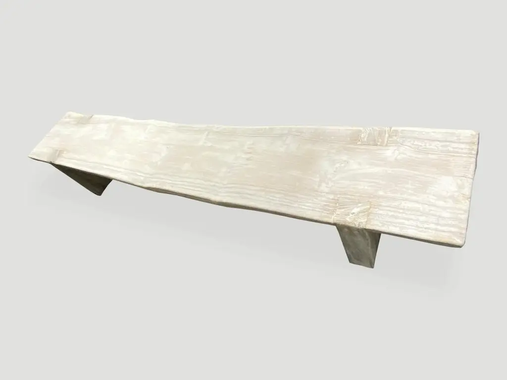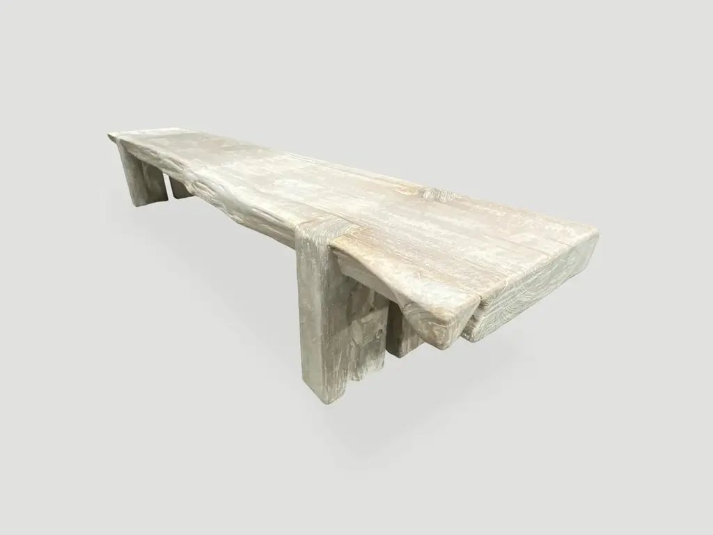 Impressive single 3.5” thick slab, reclaimed teak wood bench. We added the legs, bleached the wood and then finished with a light white wash exposing the beautiful grain of this aged teak wood bench.The St. Barts Collection features an exciting new line of organic bleached, white wash and natural weathered teak furniture. The reclaimed teak is first bleached and then left to bake in the sun and sea salt air for over a year to achieve this unique finish. Select pieces are infused with a brilliant aqua or soft blue resin that is cracked to achieve a unique quartz crystal effect. The final result evokes imagery of the white sand beaches and brilliant aqua waters of the famous French Caribbean Island.Own an Andrianna Shamaris original.Andrianna Shamaris. The Leader In Modern Organic Design.