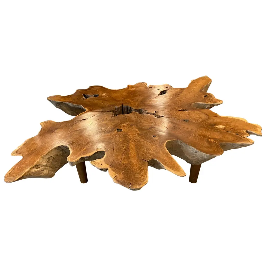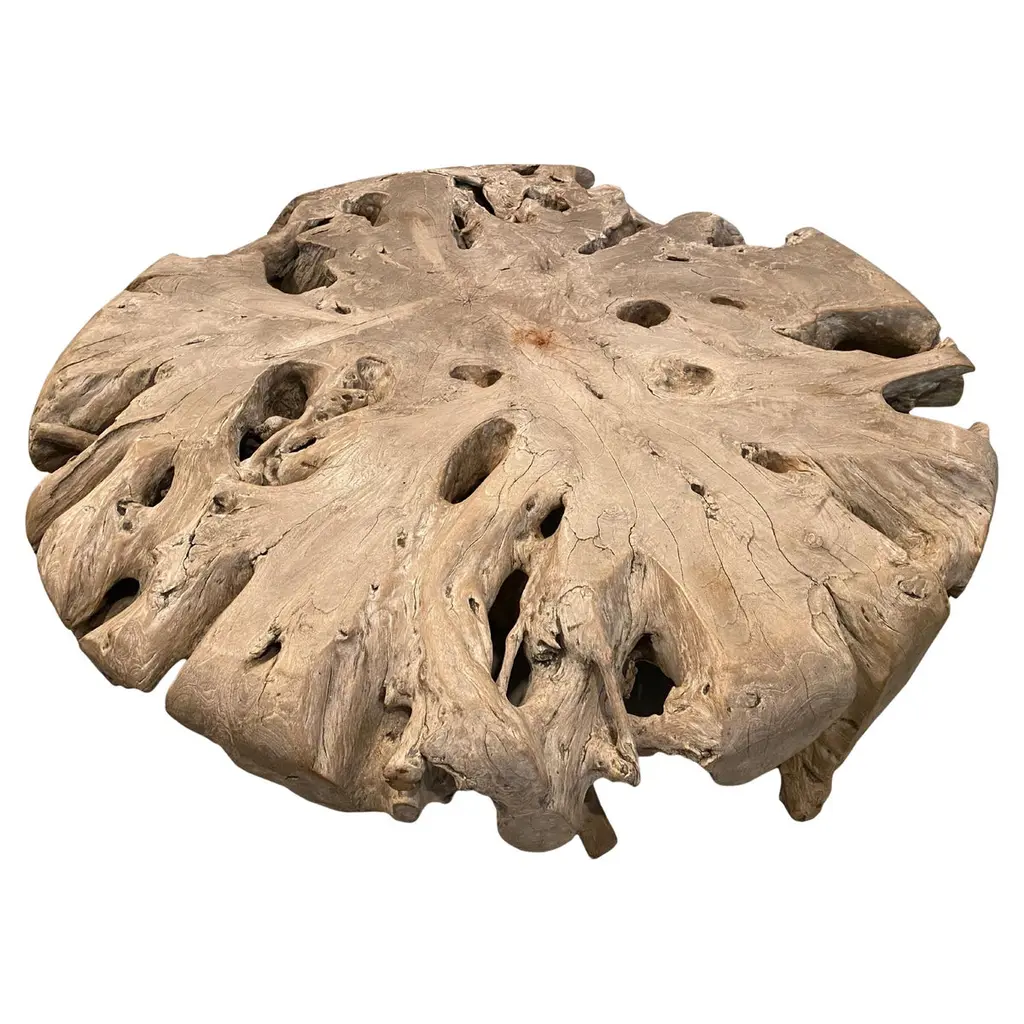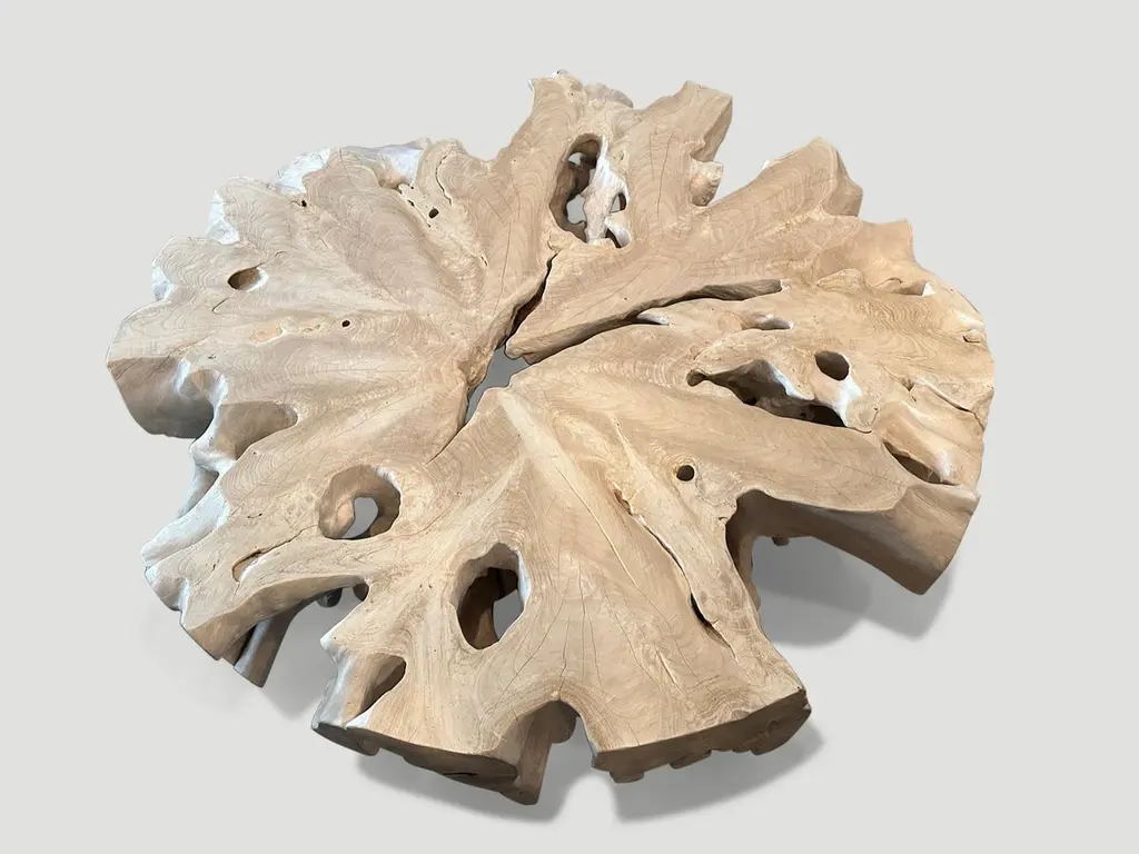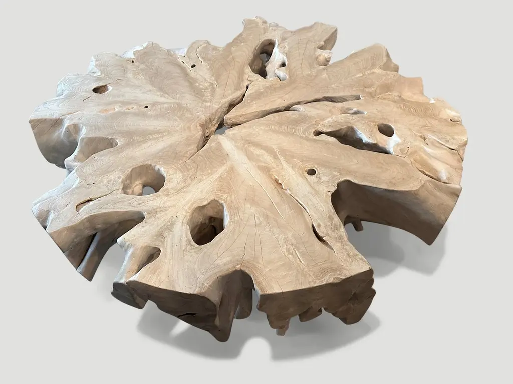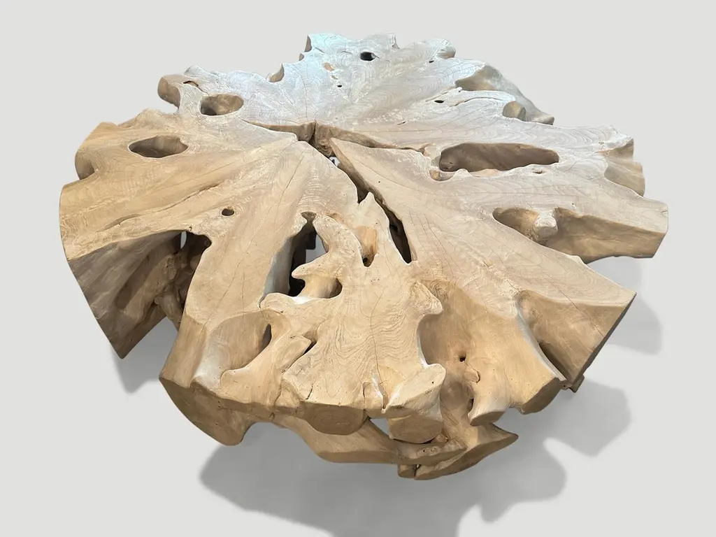 Impressive teak root coffee table. Hand carved into this beautiful shape whilst respecting the natural organic wood. We added a polish to the top and the side sections for a light bone contrast and protection. It’s all in the details. The St. Barts Collection features an exciting line of organic white wash, bleached and natural weathered teak furniture. The reclaimed teak is bleached and left to bake in the sun and sea salt air for over a year to achieve this unique finish. Select pieces are infused with a brilliant aqua or soft blue resin that is cracked to achieve a unique quartz crystal effect. The final result evokes imagery of the white sand beaches and brilliant aqua waters of the famous French Caribbean Island.Own an Andrianna Shamaris original.Andrianna Shamaris. The Leader In Modern Organic Design.