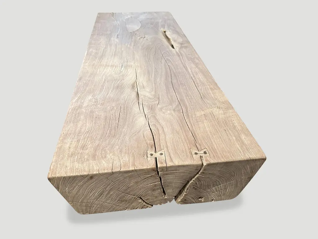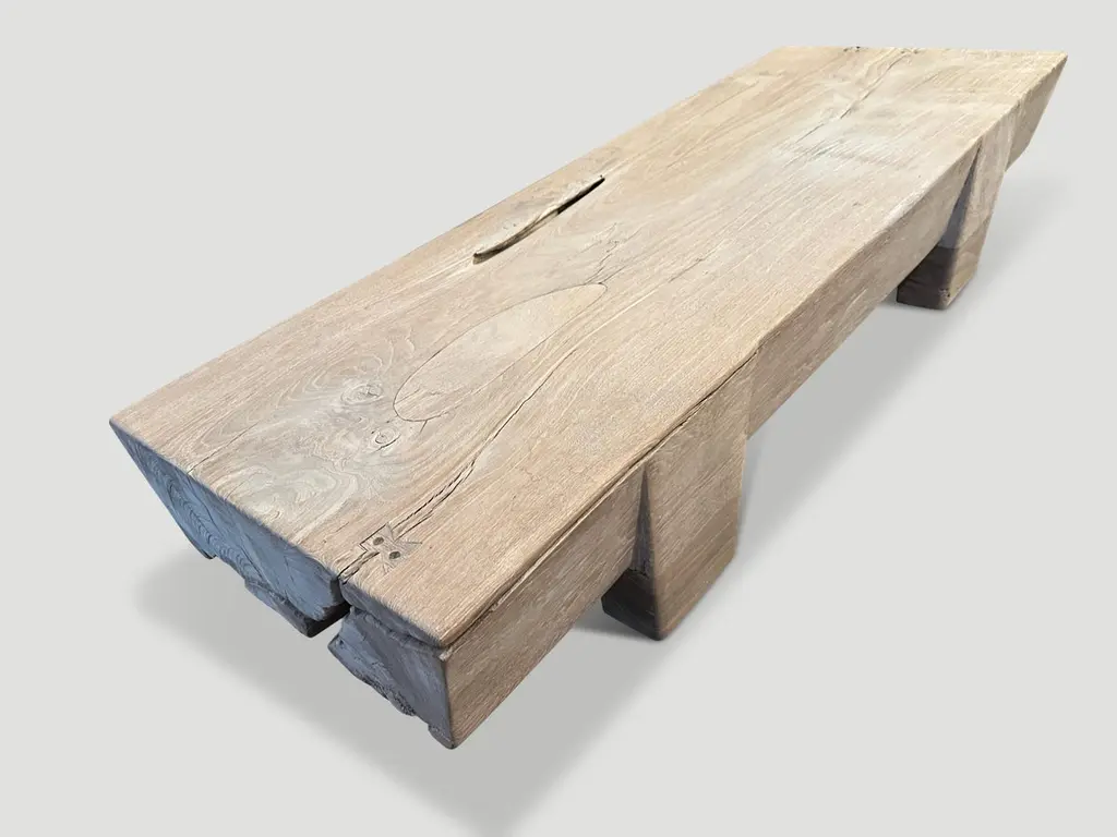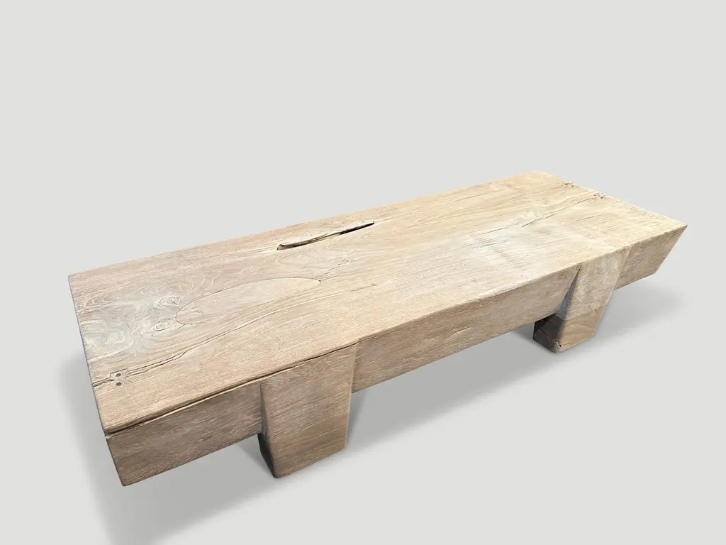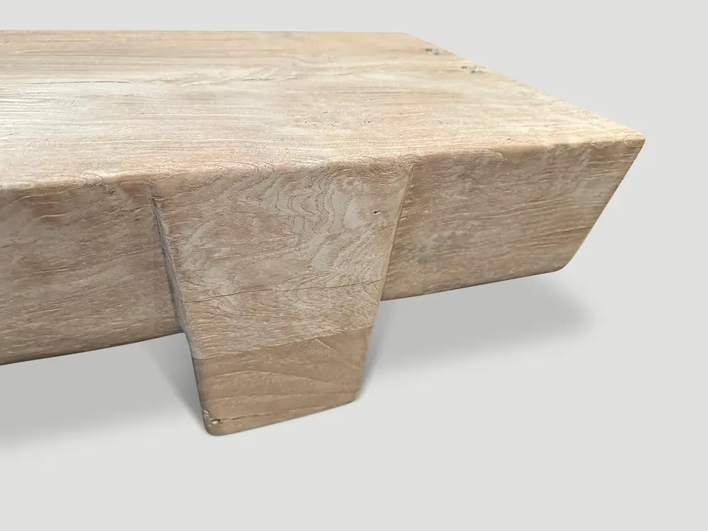 Impressive seven inch single slab coffee table made from century year old teak wood. The legs are hand carved into the top as shown. We added more for height which allows the top to float six inches off the floor and butterflies inlaid into the wood. Finished with a light white wash revealing the beautiful wood grain. It’s all in the details. The St. Barts Collection features an exciting line of organic white wash, bleached and natural weathered teak furniture. The reclaimed teak is bleached and left to bake in the sun and sea salt air for over a year to achieve this unique finish. Select pieces are infused with a brilliant aqua or soft blue resin that is cracked to achieve a unique quartz crystal effect. The final result evokes imagery of the white sand beaches and brilliant aqua waters of the famous French Caribbean Island.Own an Andrianna Shamaris originalAndrianna Shamaris. The Leader In Modern Organic Design.