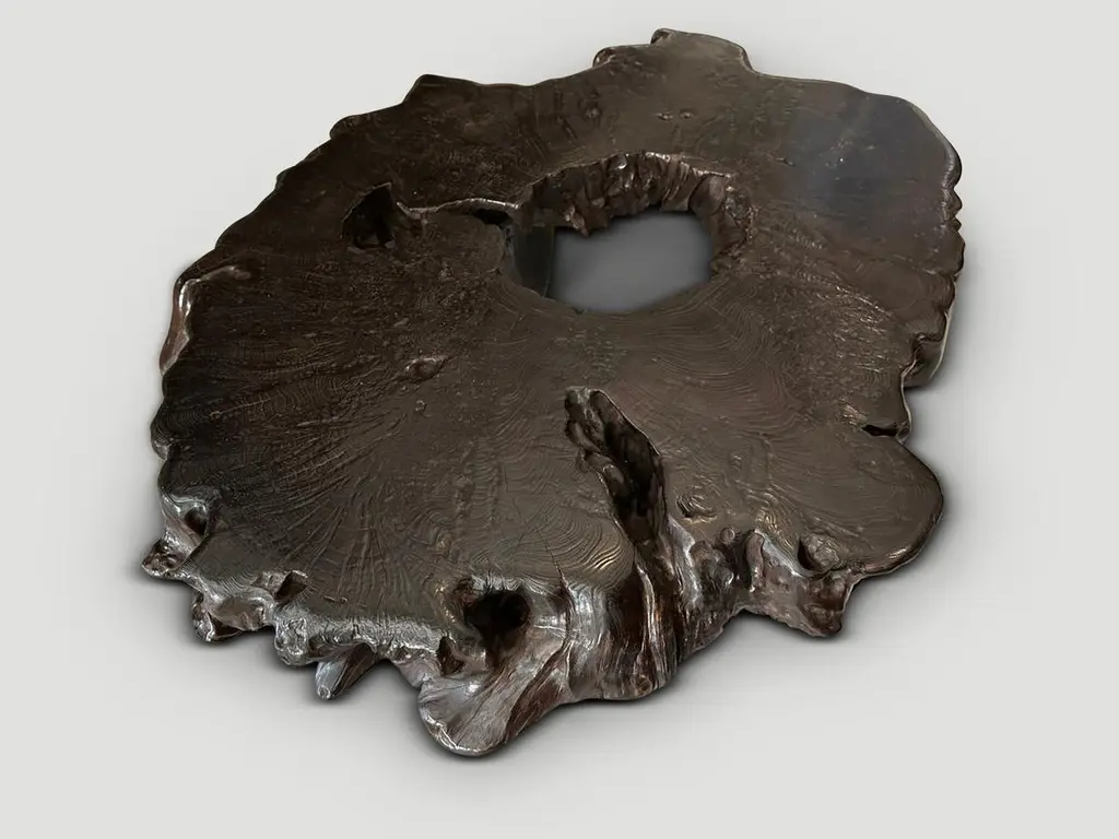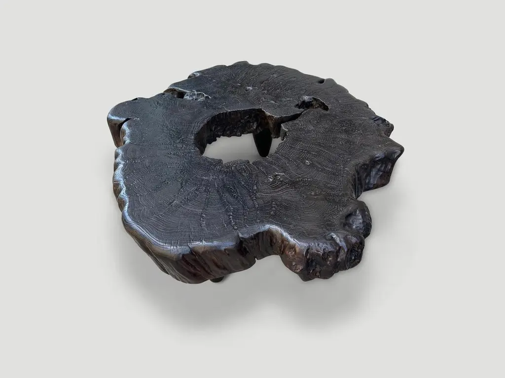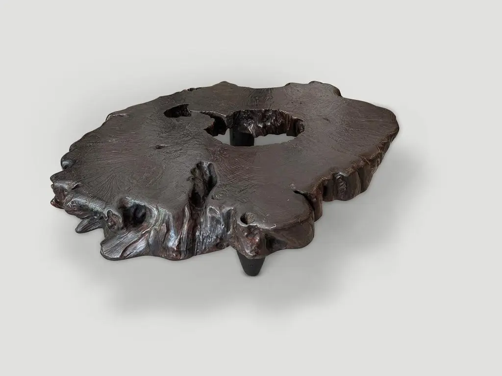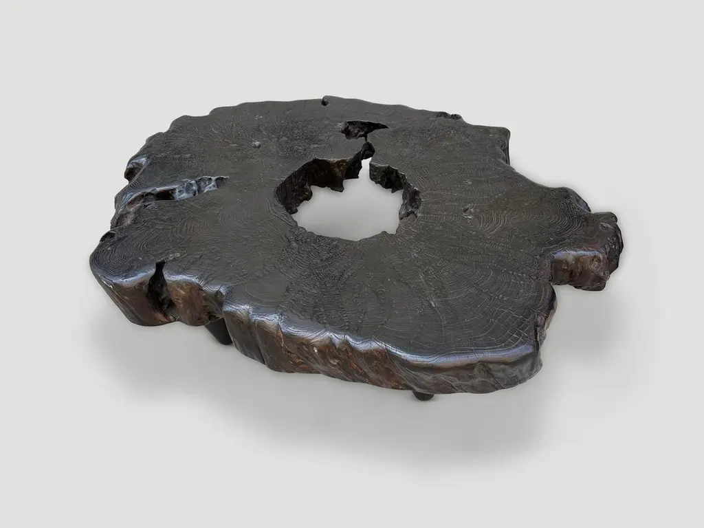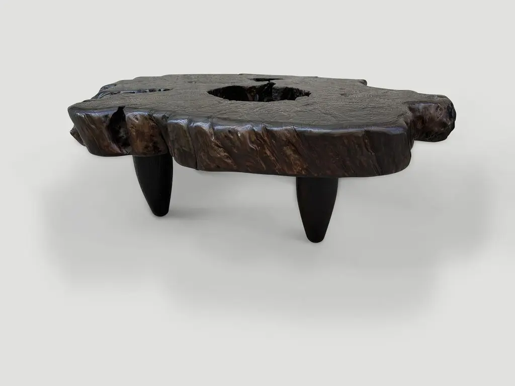 Impressive five inch single slab coffee table made from century old teak wood. We added four cone legs and finished the top with an espresso stain revealing the beautiful wood grain. Part of the Mid Century Couture Collection. Furniture constructed by hand from start to finish. It’s all in the details. Own an Andrianna Shamaris original.Andrianna Shamaris. The Leader In Modern Organic Design.