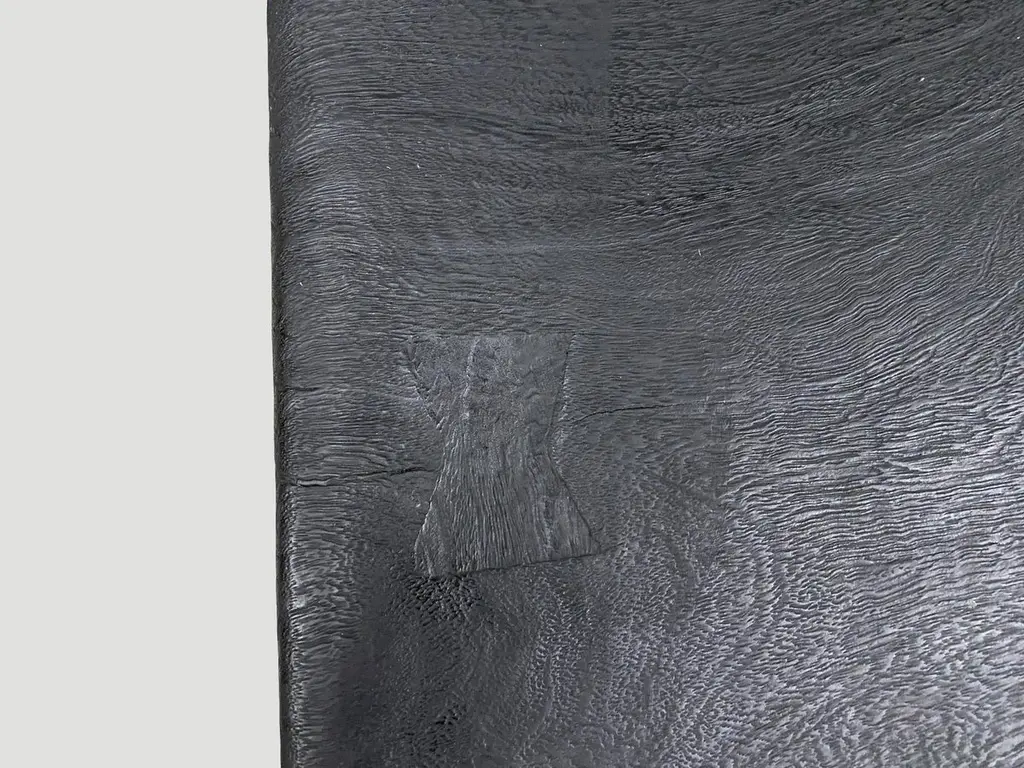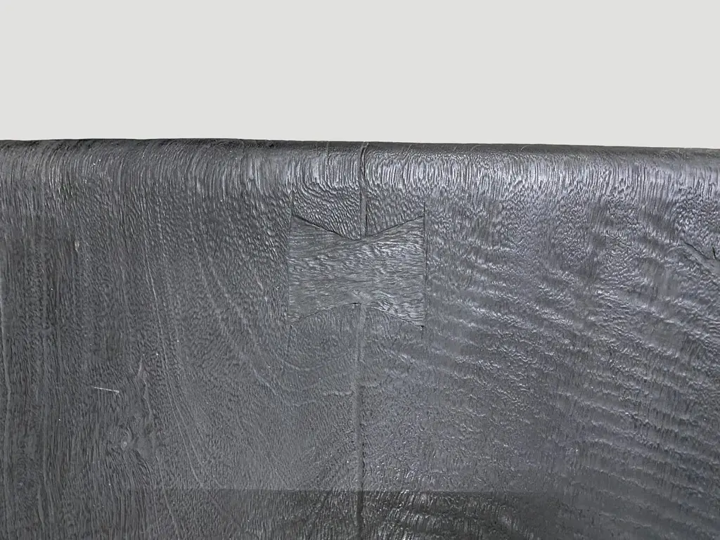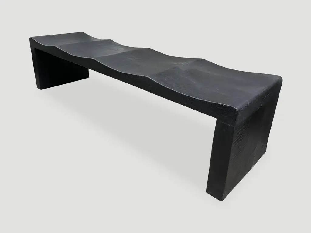 The wave bench represents a sleek, modern aesthetic, designed to provide comfort and durability. Solid reclaimed mango wood is hand carved from a single thick slab into a wave design with added butterfly detail. Burnt, sanded and sealed revealing the beautiful wood grain. Custom stains and finishes available. Please inquire.The Triple Burnt Collection represents a unique line of modern furniture made from solid organic wood. Burnt three times to produce a rich, charcoal finish with impressive depth-a result unachievable using standard stains and finishes. A perfect combination of modern and organic.Own an Andrianna Shamaris original.Andrianna Shamaris. The Leader In Modern Organic Design.