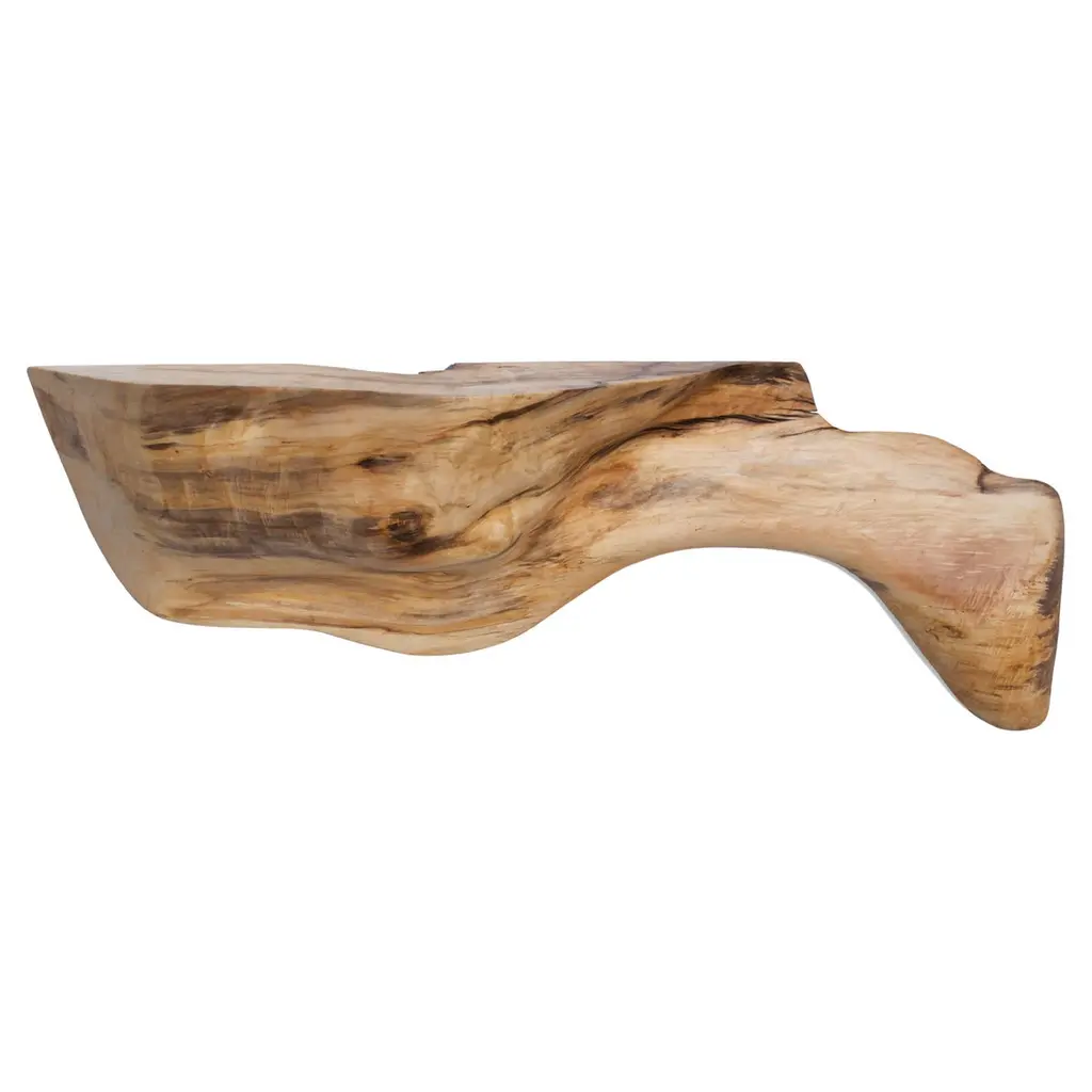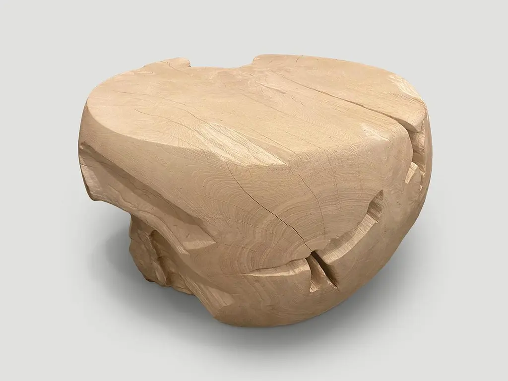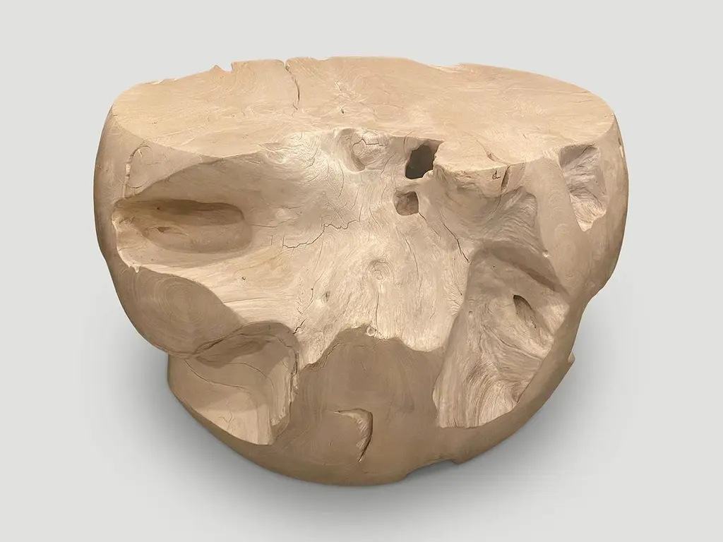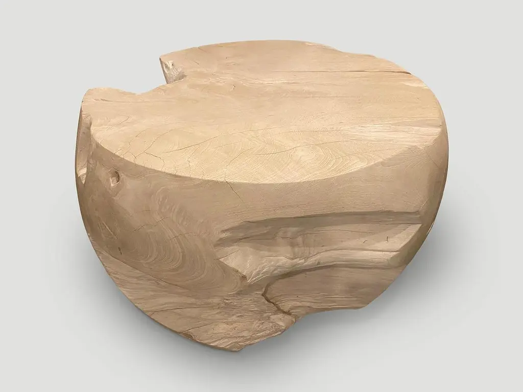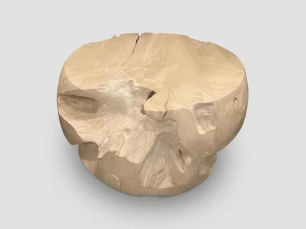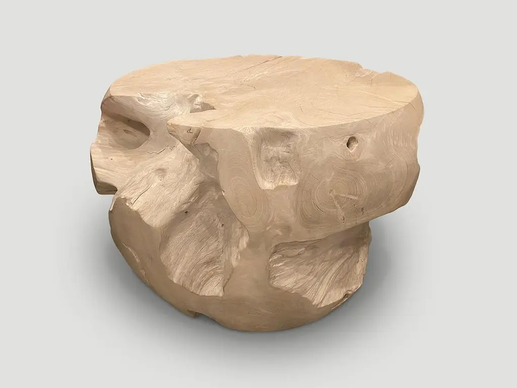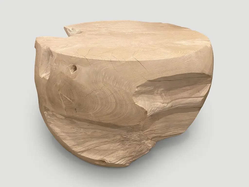 Reclaimed teak wood which we have hand carved into a beautiful drum shape coffee table, whilst respecting the natural organic wood. Bleached to a bone finish. The top is 22.5" diameter and the center is 26" diameter. Organic is the new modern. The St. Barts Collection features an exciting new line of organic white wash, bleached and natural weathered teak furniture. The reclaimed teak is bleached and left to bake in the sun and sea salt air for over a year to achieve this unique finish. Select pieces are infused with a brilliant aqua or soft blue resin that is cracked to achieve a unique quartz crystal effect. The final result evokes imagery of the white sand beaches and brilliant aqua waters of the famous French Caribbean Island.Own an Andrianna Shamaris original.Andrianna Shamaris. The Leader In Modern Organic Design.