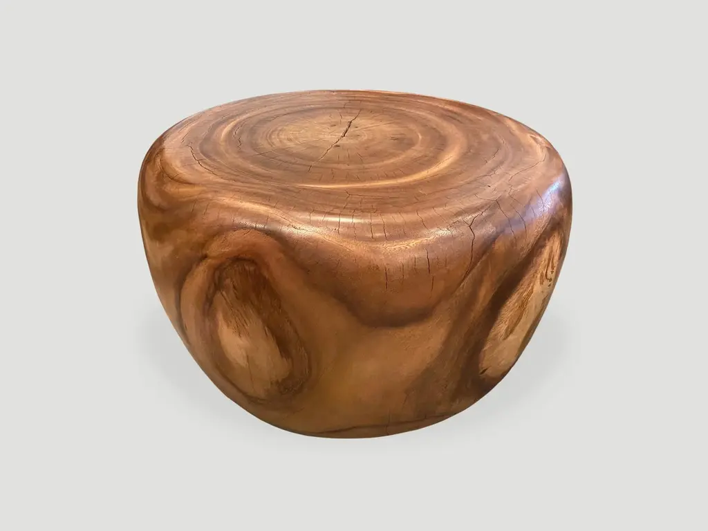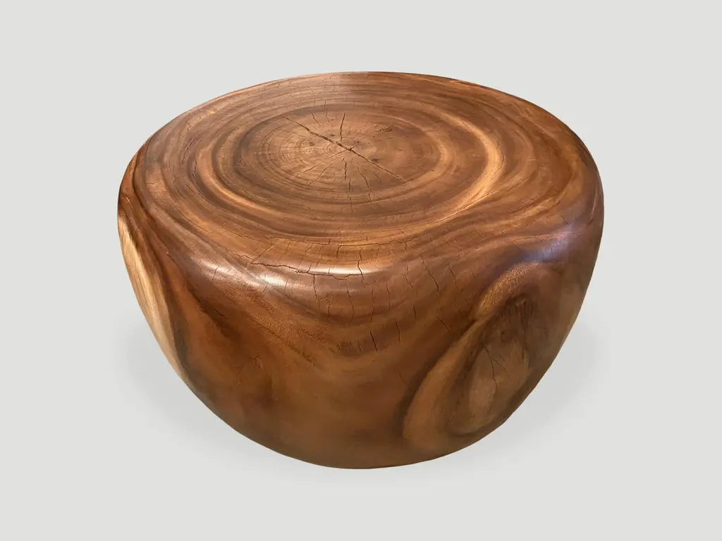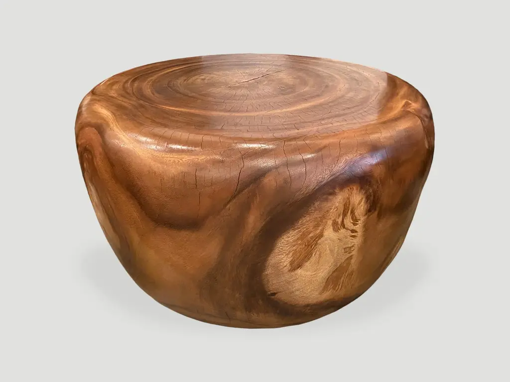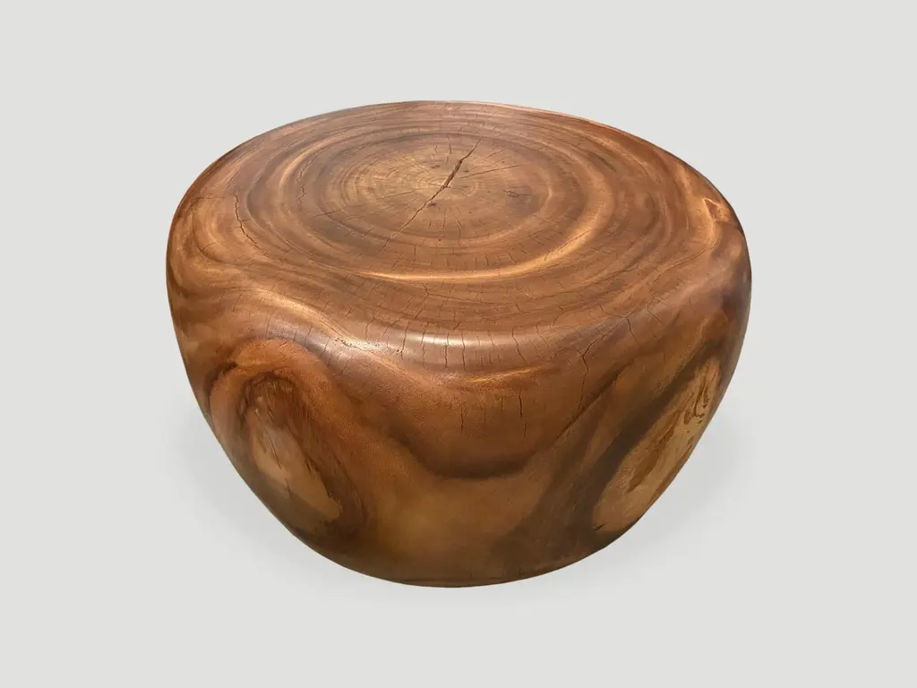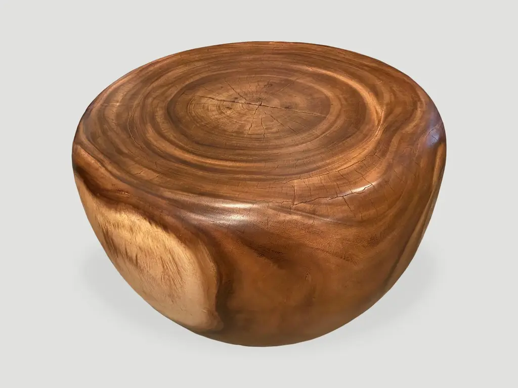 Beautiful wood grain on this reclaimed suar wood coffee table. Hand carved into an impressive drum shape. Natural oil finish. Own an Andrianna Shamaris original.Andrianna Shamaris. The Leader In Modern Organic Design.