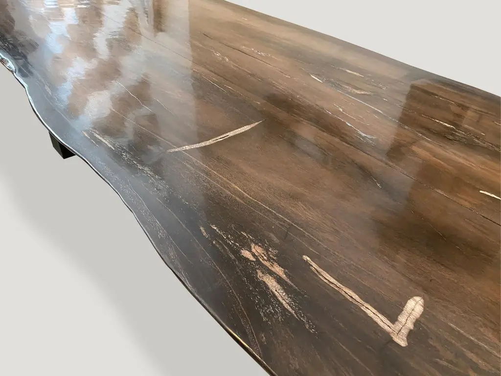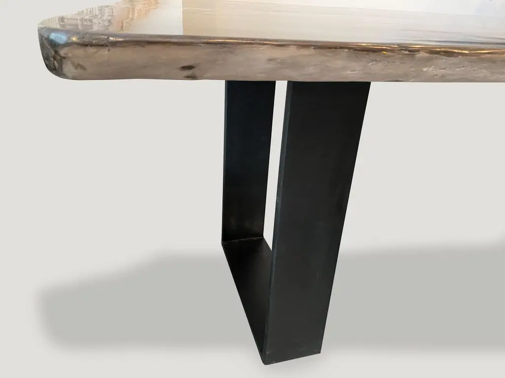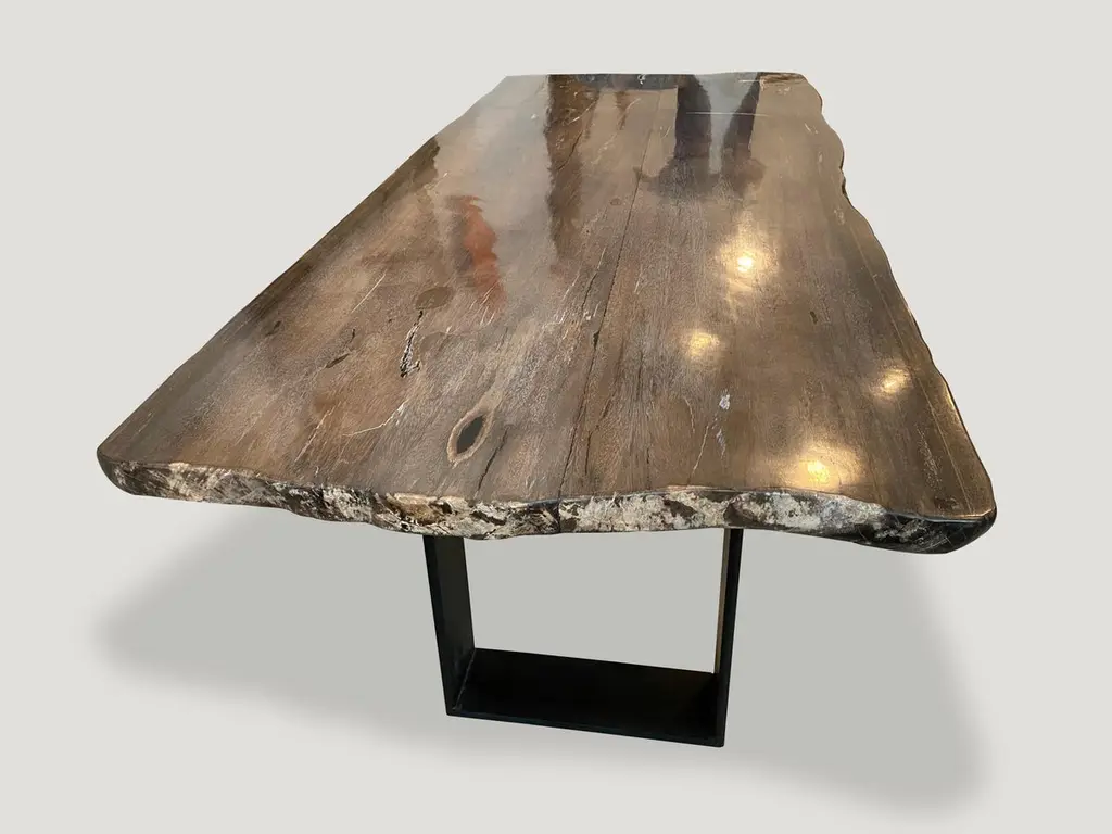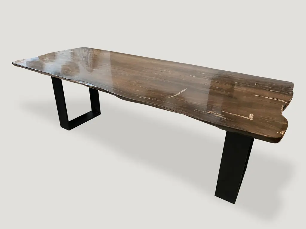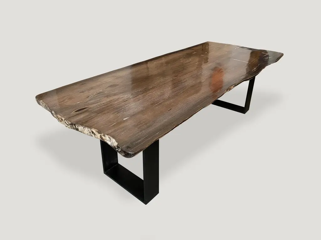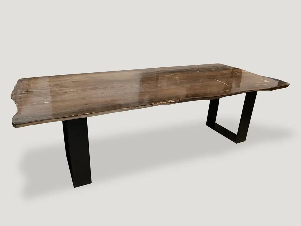 High quality petrified wood live edge dining table, coffee table or counter top. This two inch thick slab is shown with a black solid steel base which we can also switch out for two espresso stained wooden bases, coffee table height, if preferred. Stunning Minimalist tones on this impressive dining table.As with a diamond, we polish the highest quality fossilized petrified wood, using our latest ground breaking technology, to reveal its natural beauty and contrasting tones. It is then transformed into a unique piece of furniture, unlike any other petrified wood you might find.We source the highest quality petrified wood available. Over 40 million years old. Each piece is hand selected and highly polished with minimal cracks. Petrified wood is extremely versatile – even great inside a bathroom shower. Perfect as a cocktail table, side table or clustered as a coffee table. We can also custom large slabs for counter tops, dining tables or coffee tables.We have an ever-evolving collection of High Quality Petrified Wood. We only select the best.Andrianna Shamaris. The Leader In Modern Organic Design.