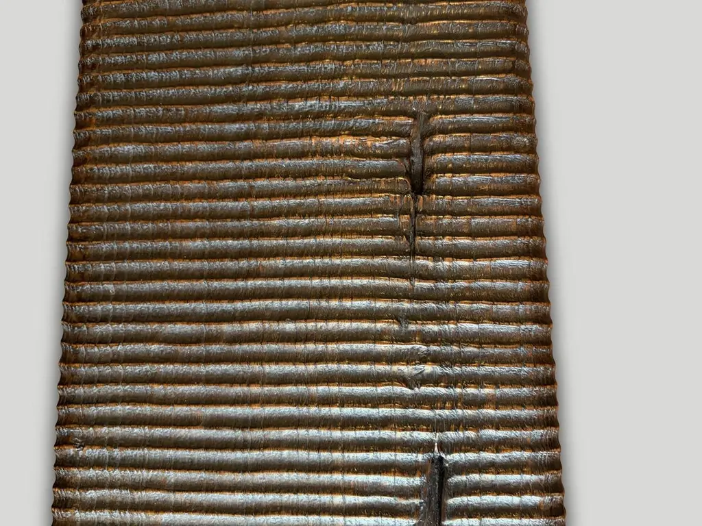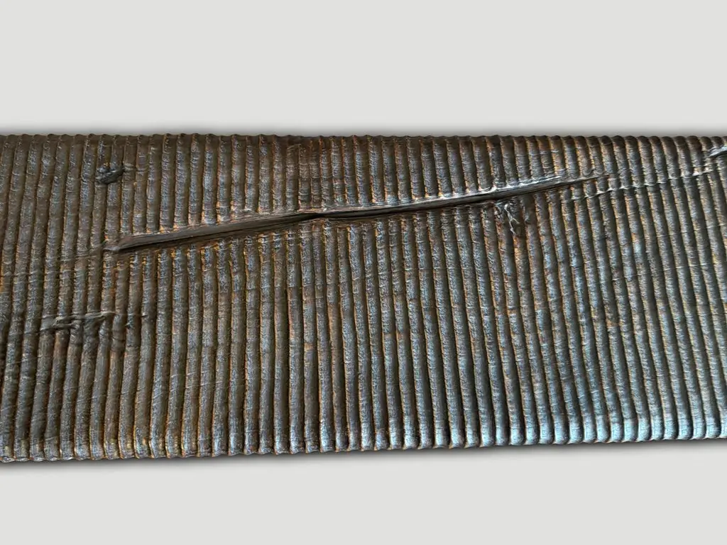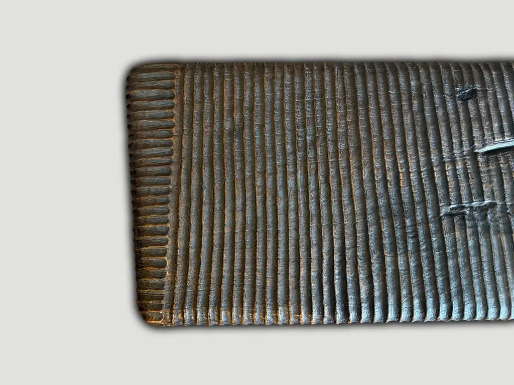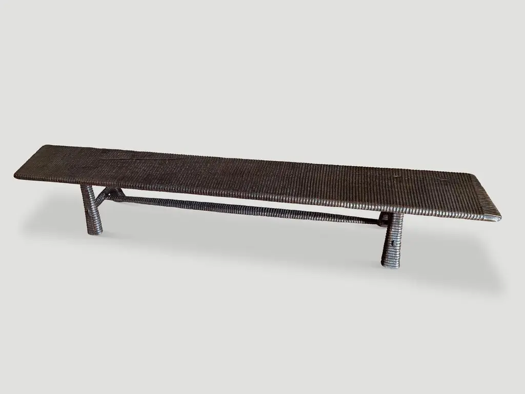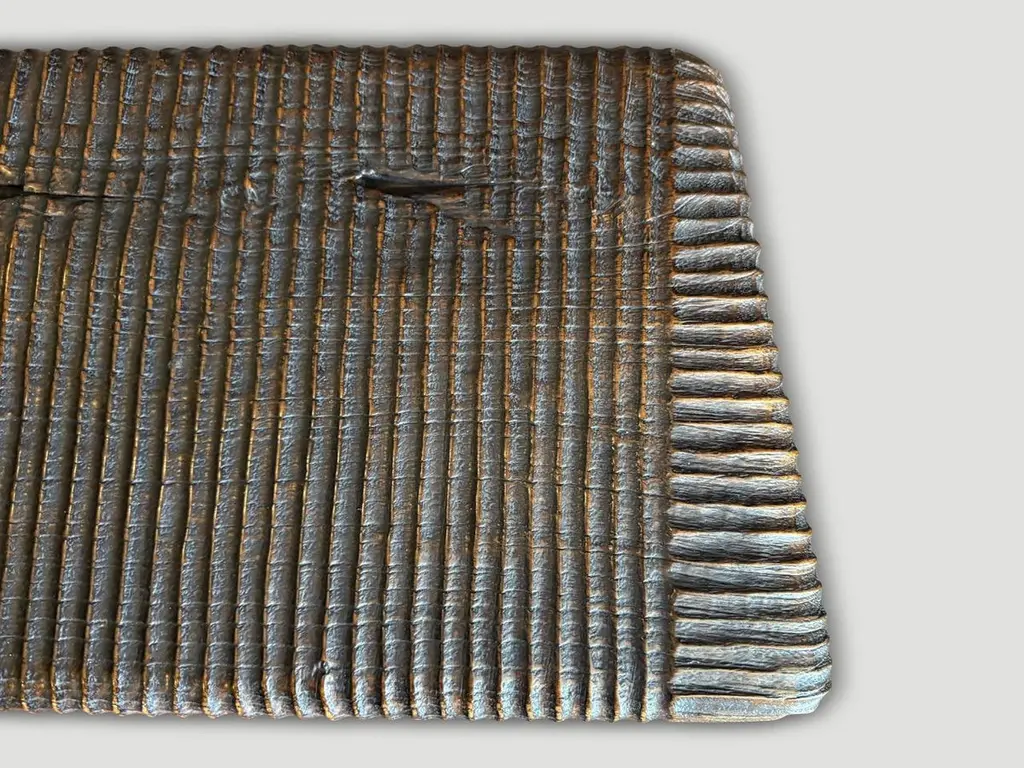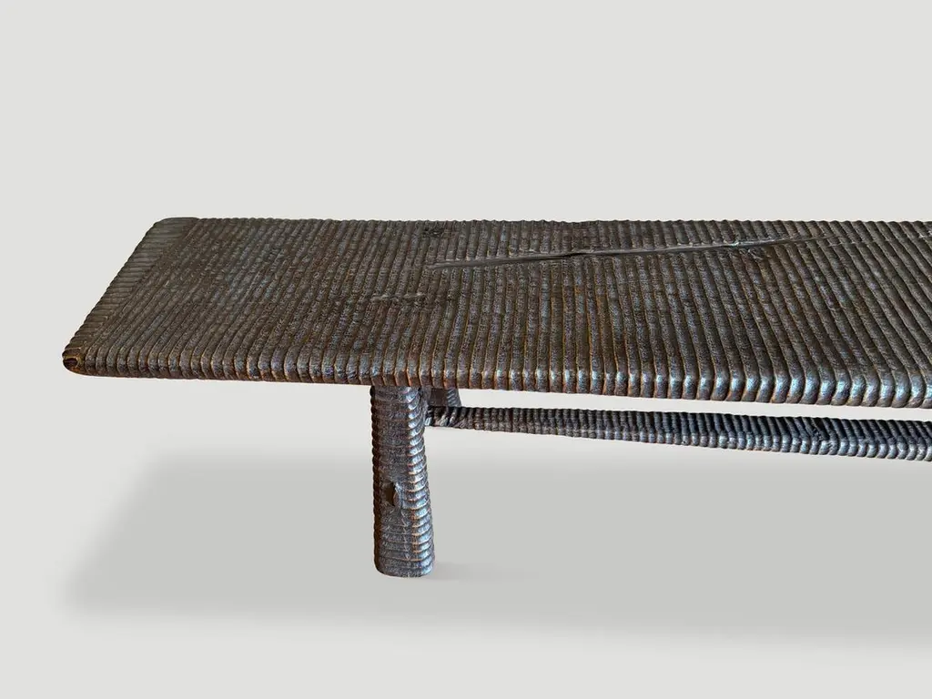 A beautiful single slab of teak wood from my finest collection is hand carved by our master carver to produce this impressive bench. The Mid-Century Couture Collection, features our unique minimalist carving. We added mid century style legs to this exquisite top with butterflies inlaid into the wood. Finished with a chocolate stain and a wire brush revealing the unique wood grain. Both usable and sculptural. It’s all in the details.Own an Andrianna Shamaris original.Andrianna Shamaris. The Leader In Modern Organic Design.