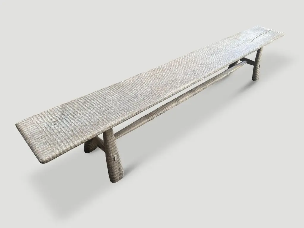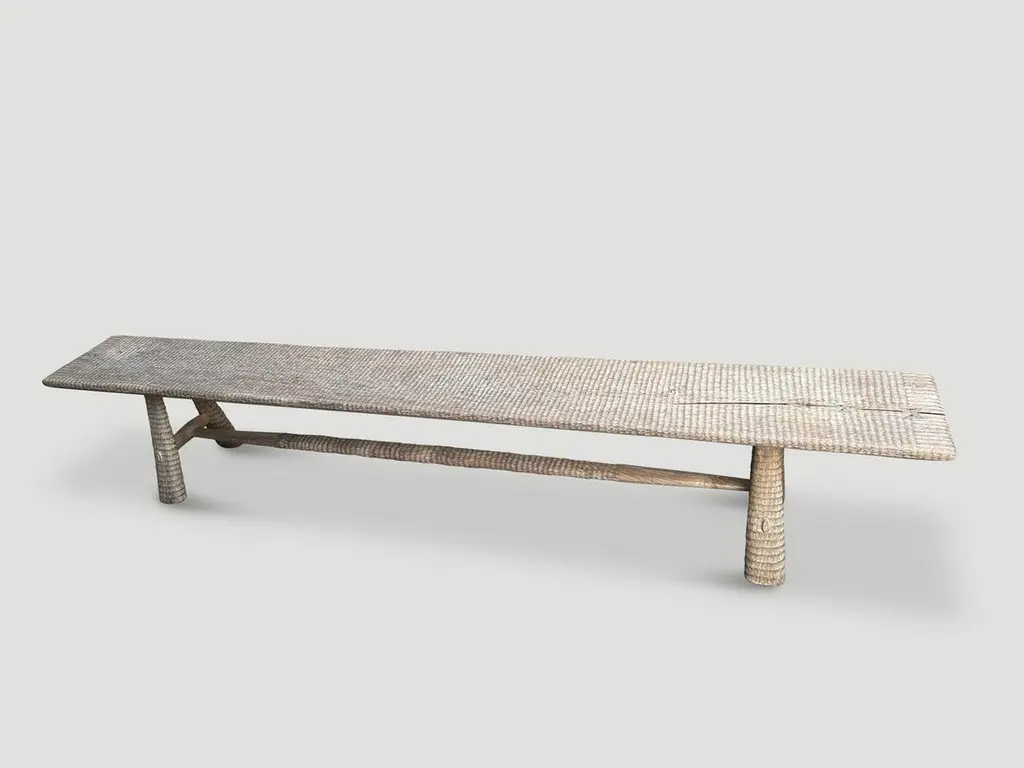 A beautiful single slab of teak wood taken from my finest collection is hand carved by our master carver to produce this impressive bench. The Mid-Century Couture Collection, features our unique minimalist carving. We added mid century style legs to this exquisite top with butterflies inlaid into the wood. Finished with a translucent white wash stain revealing the stunning wood grain. Both usable and sculptural. It’s all in the details.Own an Andrianna Shamaris original.Andrianna Shamaris. The Leader In Modern Organic Design.