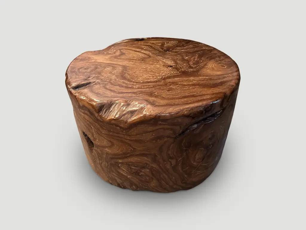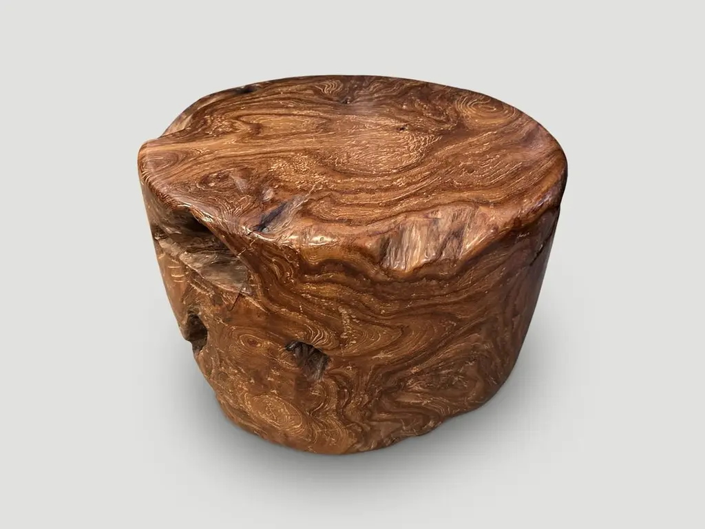 Century old solid teak wood coffee table or side table. Taken from my finest collection and hand shaped into this stunning piece of art. Both usable and sculptural. We added a natural oil revealing the beautiful wood grain. It’s all in the details.Own an Andrianna Shamaris original.Andrianna Shamaris. The Leader in modern organic design.