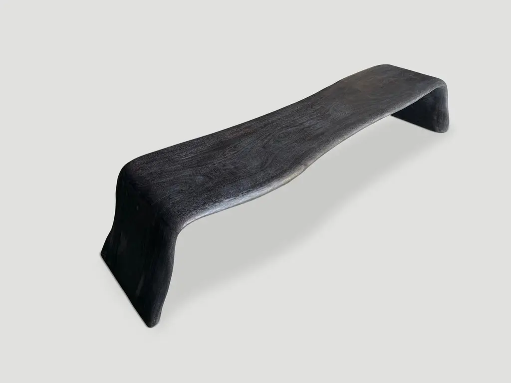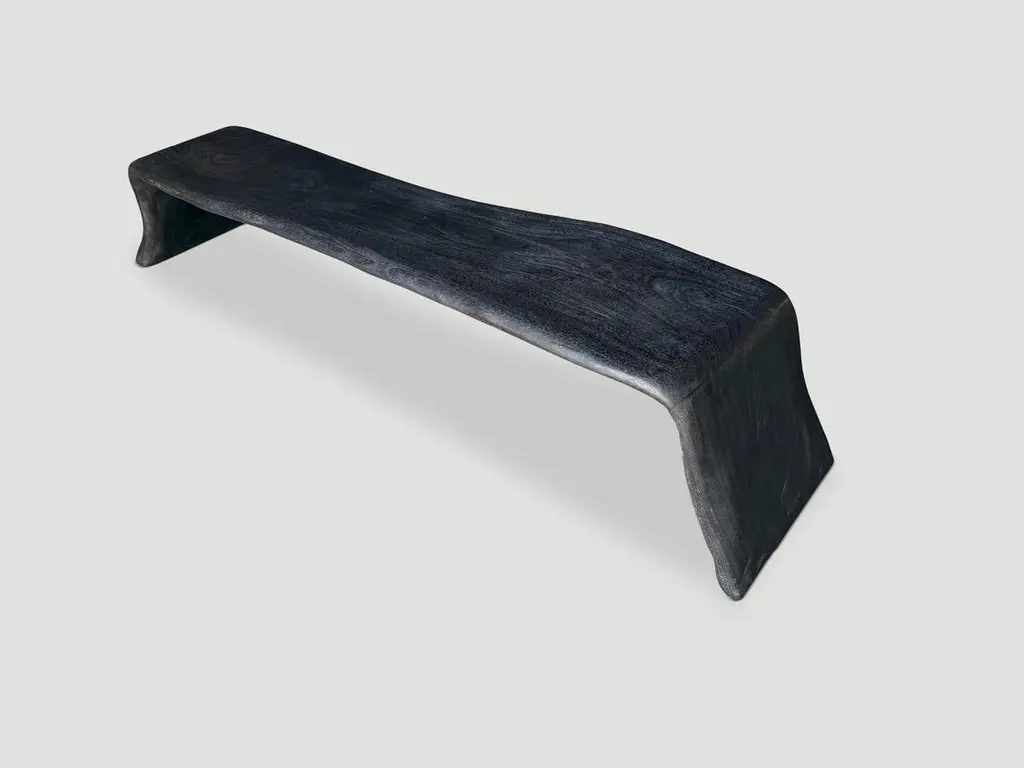 Beautiful minimalist charred coffee table or bench. Both usable and sculptural. Full dimensions; Top 68” wide x 15”-18″ deep x leg extends 80” wide x 15 high.The Triple Burnt Collection represents a unique line of modern furniture made from solid reclaimed wood. Burnt three times to produce a rich, charcoal finish with impressive depth-a result unachievable using standard stains and finishes. A perfect combination of modern and organic.Own an Andrianna Shamaris original.Andrianna Shamaris. The Leader In Modern Organic Design.