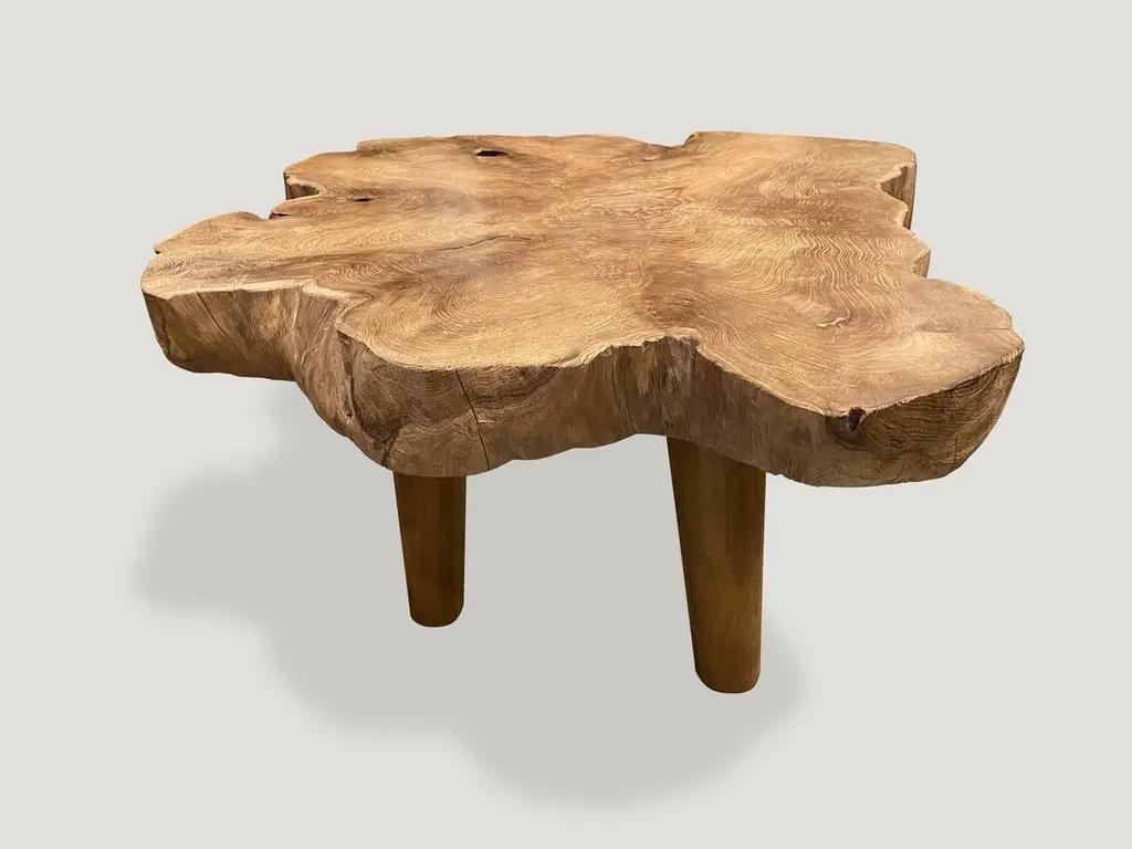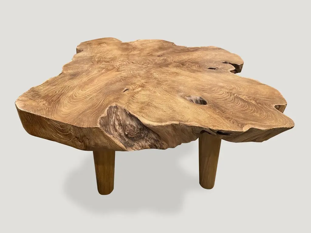 Impressive three inch single slab live edge teak wood made into a coffee table set on minimalist mid century style legs. Finished with a natural oil revealing the beautiful wood grain. We have a collection. The price and images reflect the one shown. Own an Andrianna Shamaris original. Andrianna Shamaris. The Leader In Modern Organic Design.